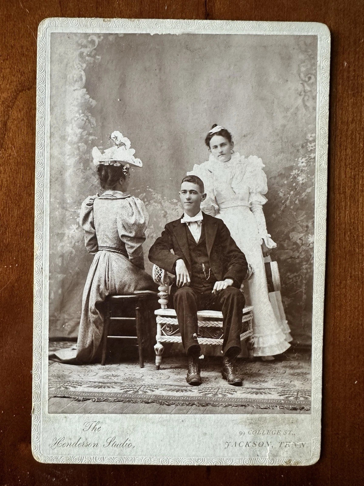 Original 1890s cabinet photo of three people, all identified on the back: Louise Wilkinson, standing, her fiance Will Hunt, and her friend May Weatherly. Louise was born in 1879 and died in 1901, only a few years after this photo was taken.