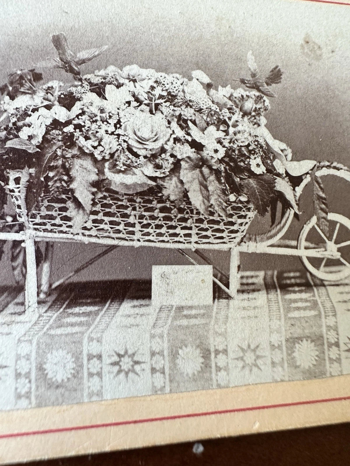 An interesting 1870s CDV showing a flower cart full of flowers. I'm not sure if these are memorial or not, but it's possible, particularly with addition of the doves and sign... maybe a memorial display for a gardener / garden club member dedicated by their friends. There is also a sign but I can't quite make out what it says. Unusual image.