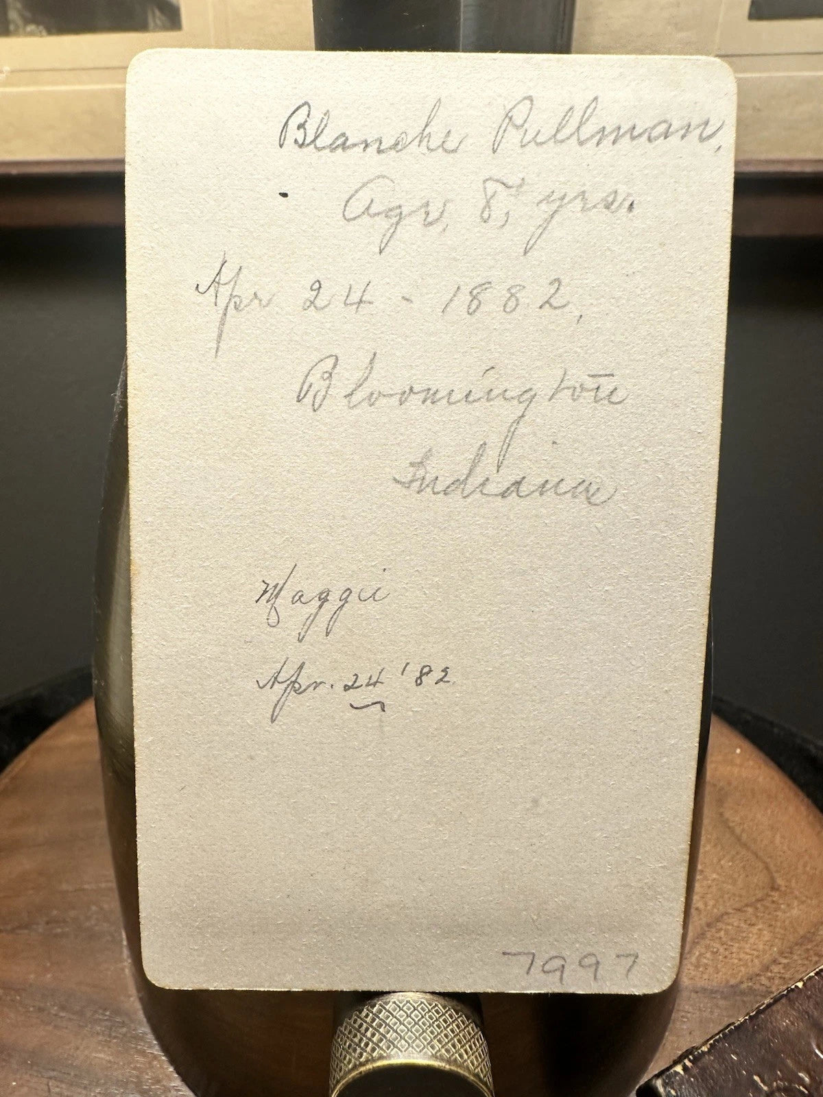 CDV of a girl balancing on a ball, fully identified on the back as Blanche Pullman Age 8, April 24, 1882, Bloomington, Indiana. It also says Bloomington, Ind on the front bottom margin.