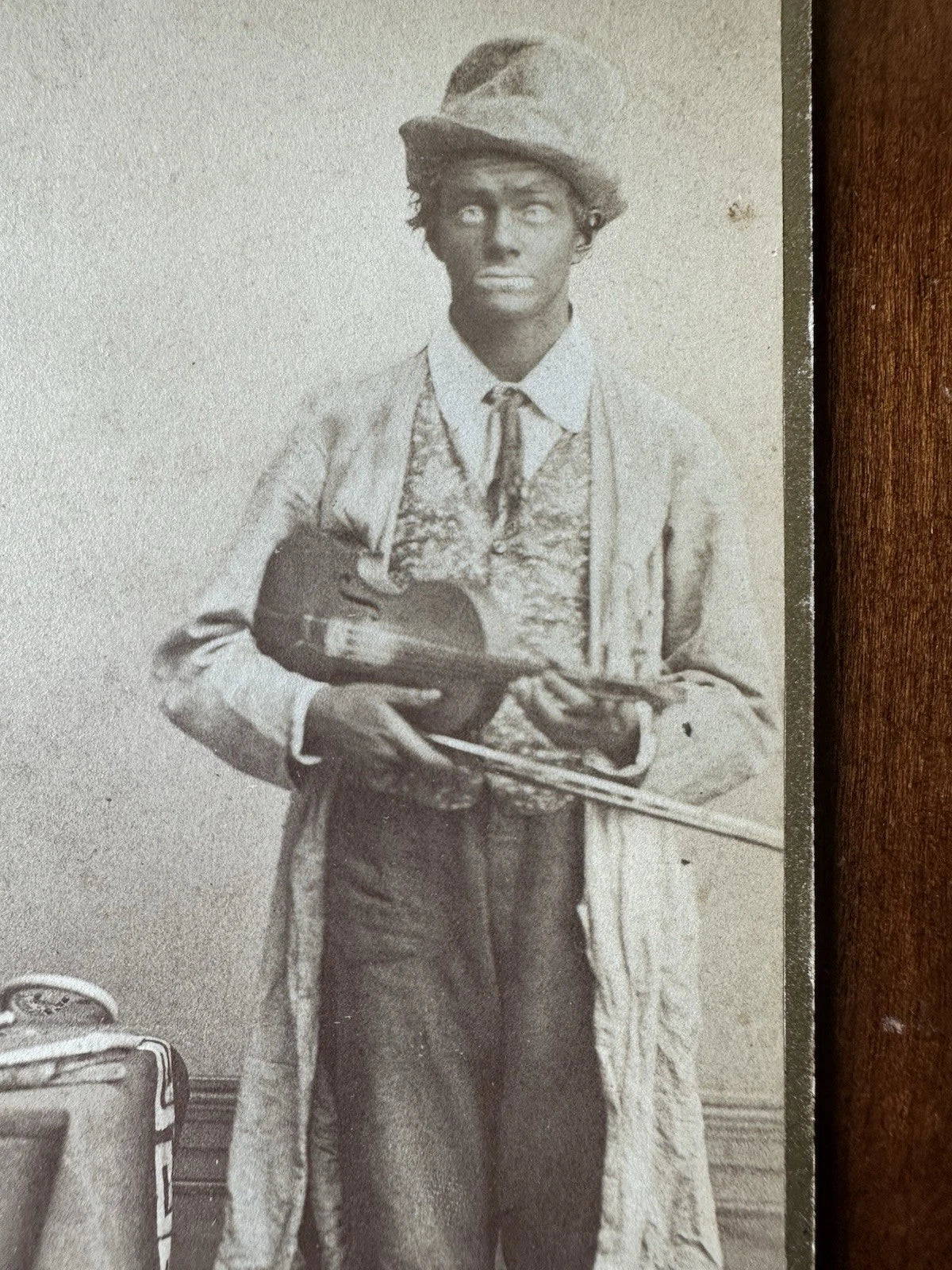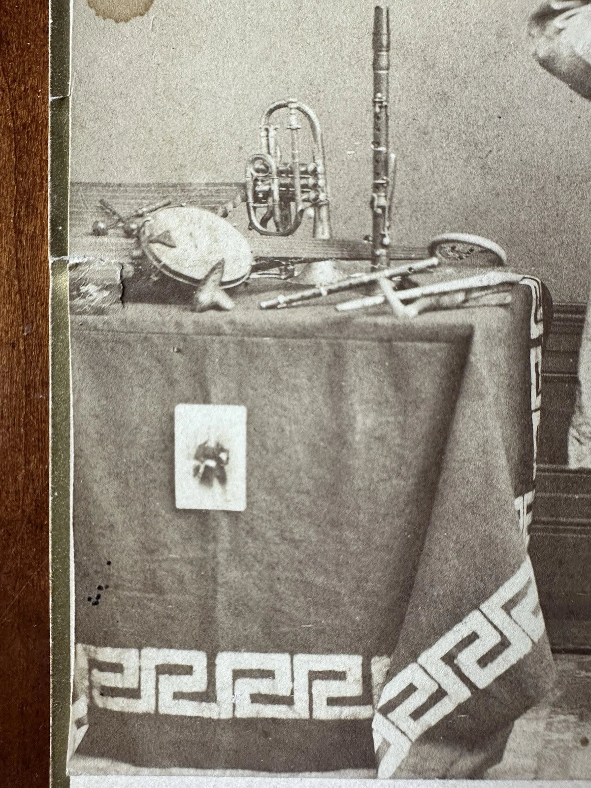 Original cabinet card (7 inches by 4 inches) of Gus A. Sharplie, who was a musician and composer who lived in Evansville, Indiana. Some mount edge and corner wear, etc. There is a horizontal crease across the mount, barely visible as a light ridge on the front.