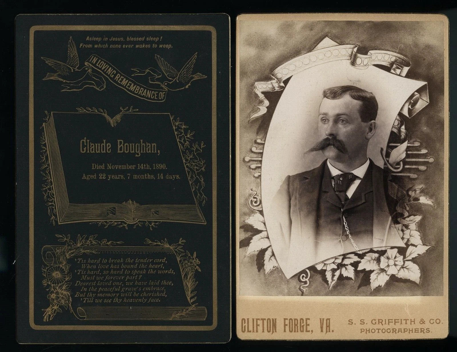 Two original cabinet card cards, a memorial portrait of (John) Claude Boughan with mourning/memorial scrollwork and design, and his memorial card. Both are 6.5" x 4.25" and in very good to excellent antique condition. Shipping: Ground photo mailer. Boxed Priority also available.
