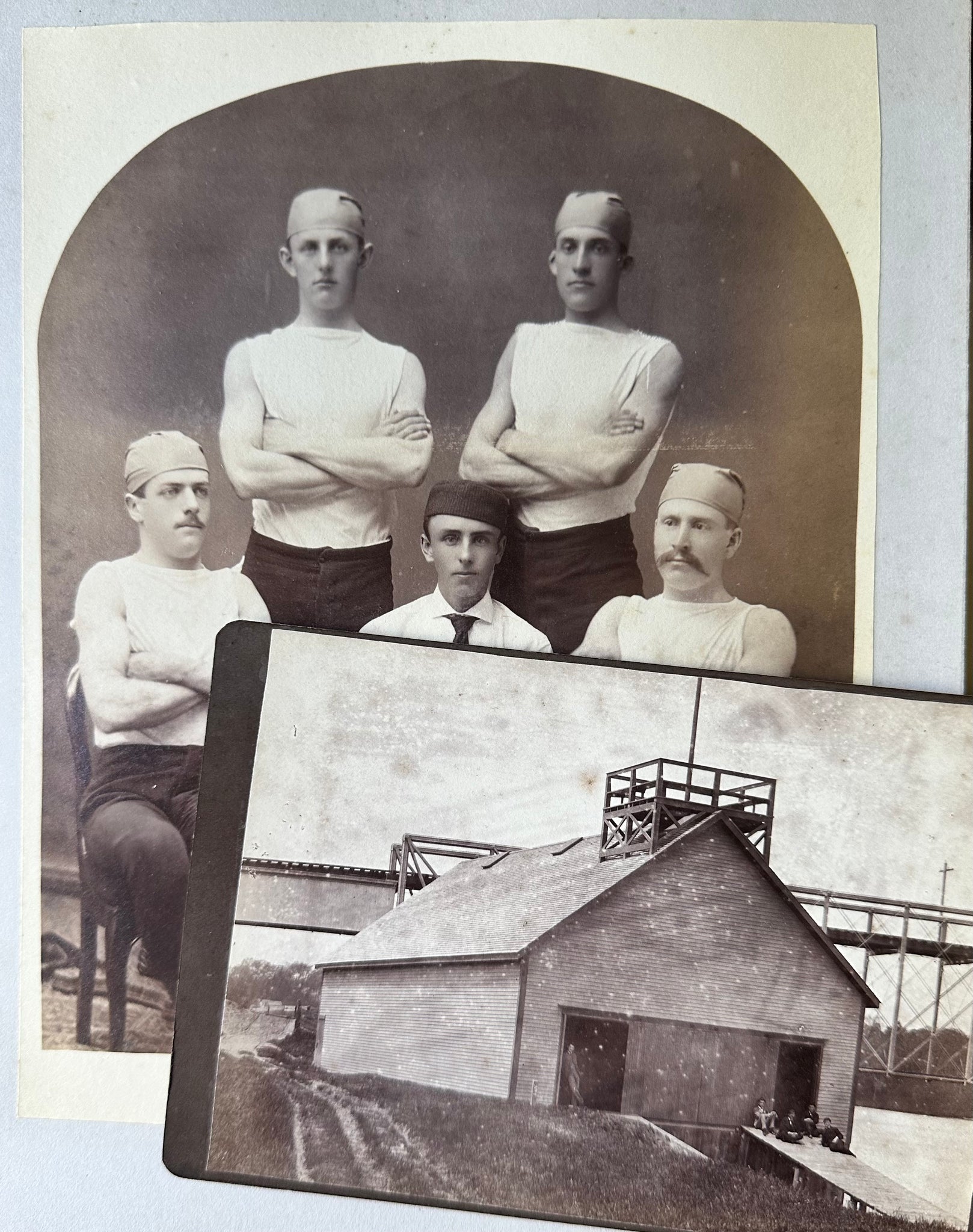 Two original photographs: a mounted 1870s albumen photo (on its original approx 10" x 8" mount) of the Bowdoin College rowing team, and the boathouse, which is a 6.5" x 4.25" cabinet card. Both of these were from a Bowdoin college photo album. Large albumen is in very good or excellent antique condition. Smaller cabinet card is in very good antique condition with light foxing. Boxed shipping.