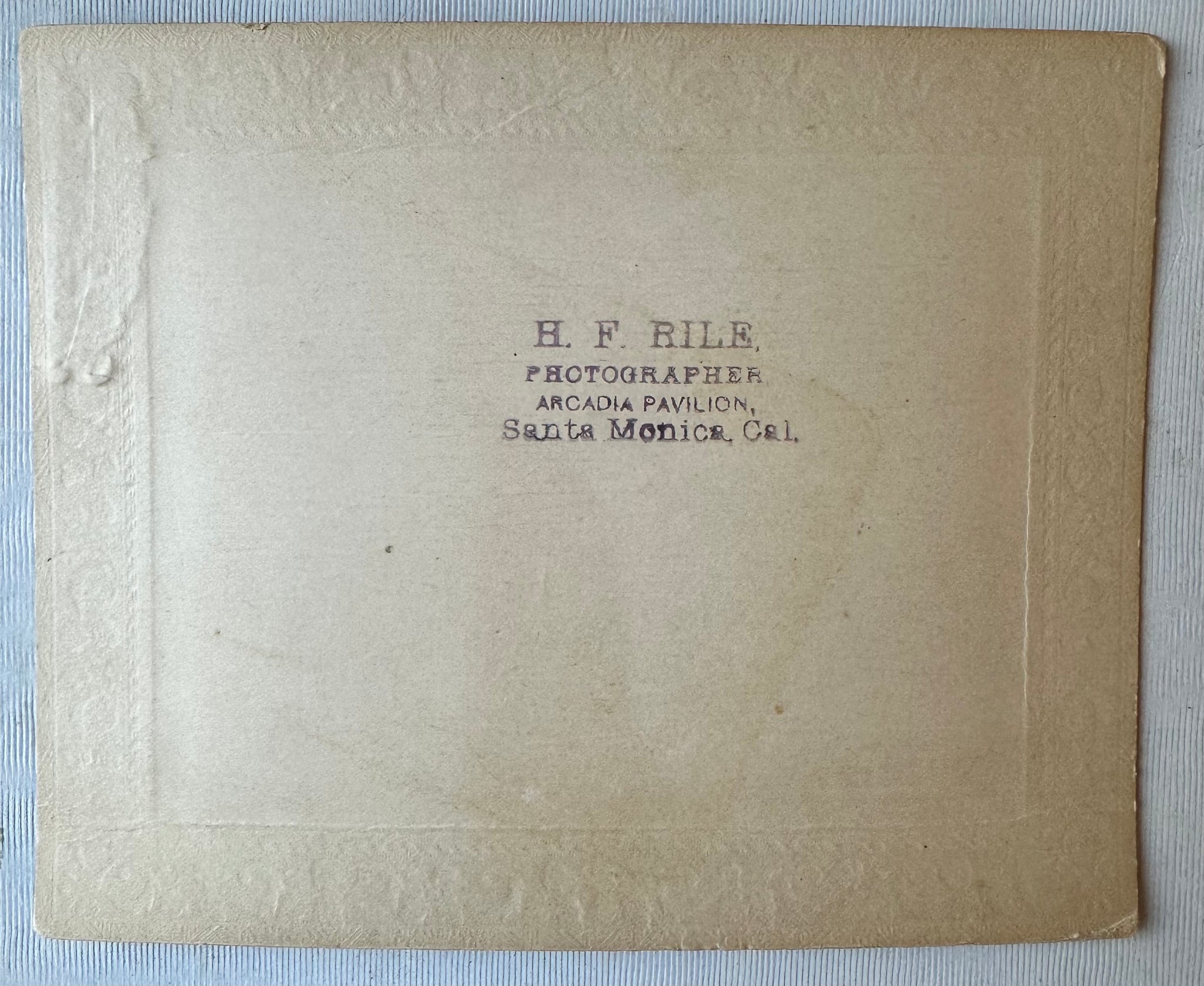 Original early-1900s cabinet photo showing a woman and her son with a prop moon - the little boy is very happy and grabbing the moon's nose. Imprint on the front and on the back is for H.F. Rile's gallery on the Santa Monica boardwalk. Dimensions of mount, approximately 5.5” x 4.5”. Image is in very good antique condition with light mount wear. Shipping: Ground photo mailer with strong cardboard. Boxed Priority is also available. 8261A |