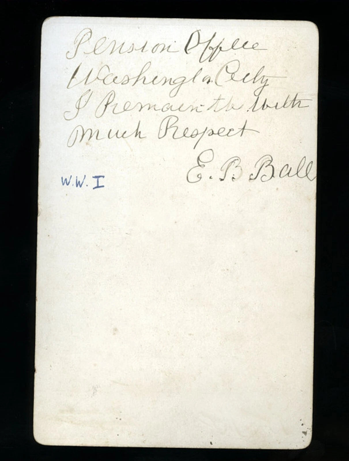On the back is an original pen inscription and signature made by Bill. Somebody came along later with a ballpoint pen and wrote WWI, but that is wrong.