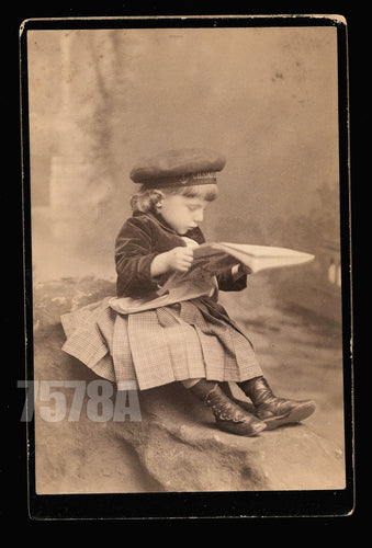 Cute Funny Cabinet Card Photo Girl Reading Newspaper NYC Photographer's Daughter
