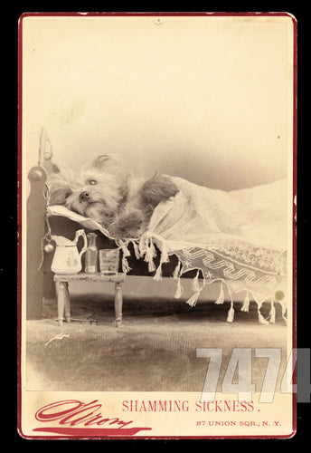 SARONY Cabinet Card Photo Cute Little Dog Playing Sick in Bed! Very Rare, 1800s