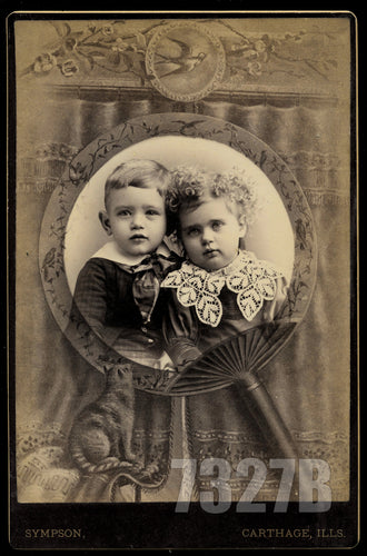 Cabinet Card Two Children, Cat & Dove Graphic Possibly Memorial Photo Illinois