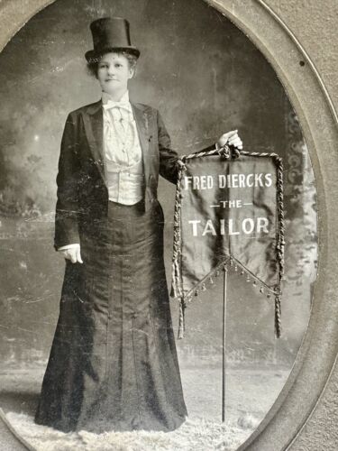 RARE *HUGE* PHOTO BANNER LADY HOLDING TAILOR ADVERTISING SIGN TEXAS PHOTOGRAPHER