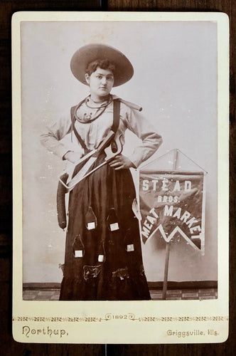 Cowgirl Banner Lady + Meat Market Sign! Great Dress Antique Advertising Photo