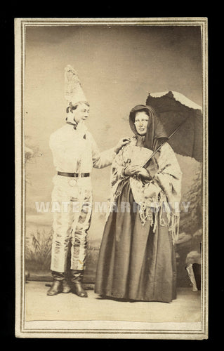 weird 1860s cdv photo dunce or clown & woman with parasol torn painted backdrop