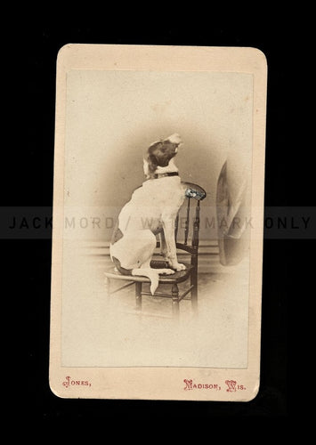 antique 19th century cdv photo of a cute spaniel dog on chair / wisconsin 1800s