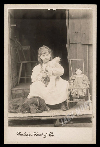 Wonderful Antique Photo, Little Girl Holding Cat, Sleeping Dog, Doll in Stroller