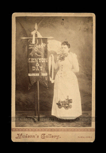 Machine Shop Banner Lady with Rare Fire Engine Pumper on Dress / Tama Iowa