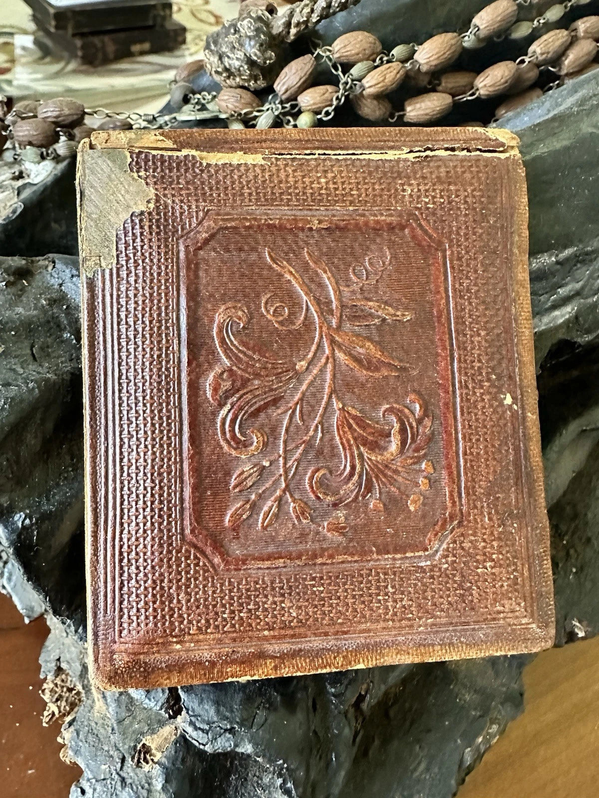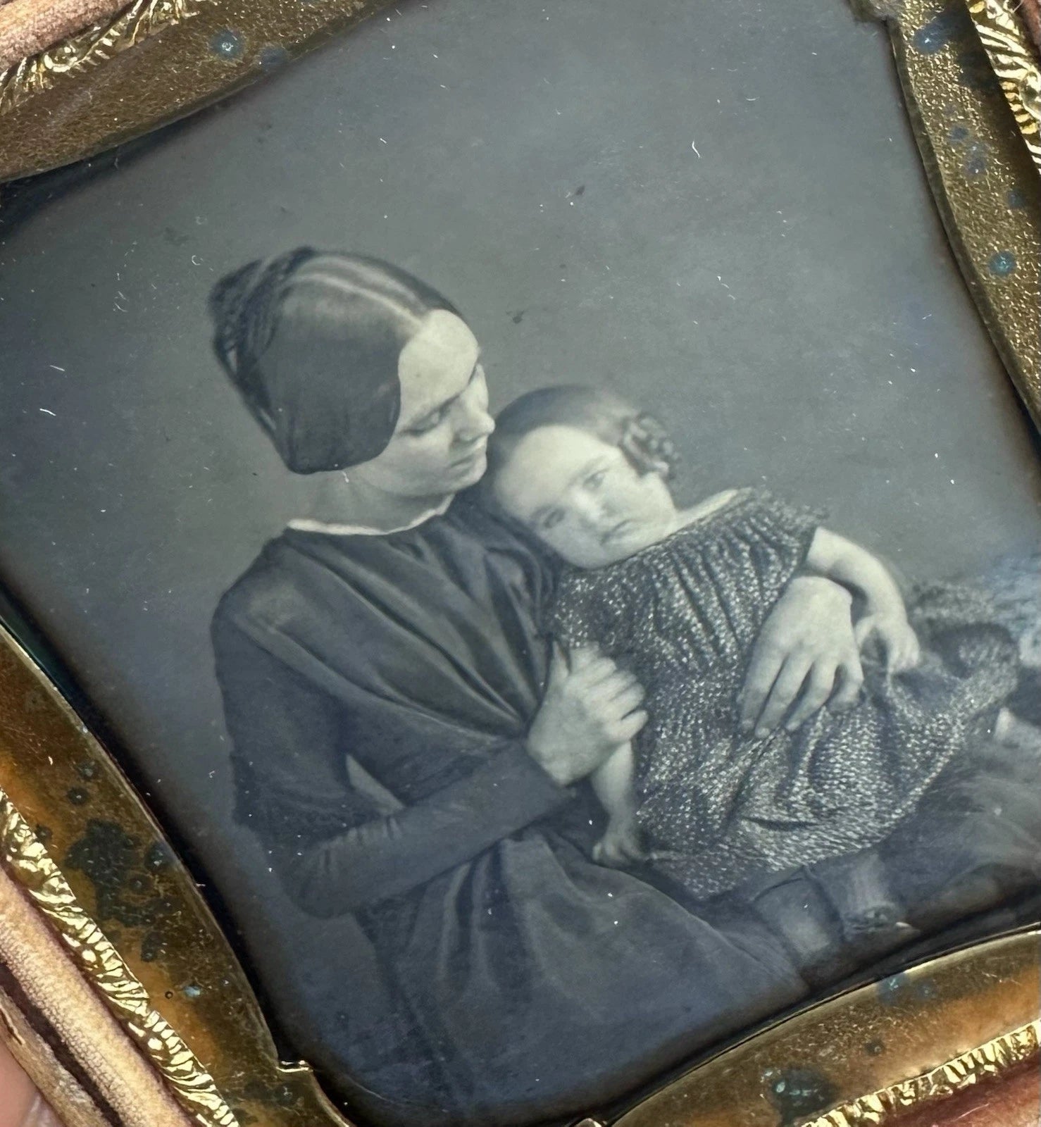Sixth-plate daguerreotype of a woman seated at a tinted blue table with a cute little girl in her lap. Dag is in half of a case with mostly detached bottom rail. Tarnish ring and a little bit of haze, though no scratch or abrasion damage noted. Seals are gone.