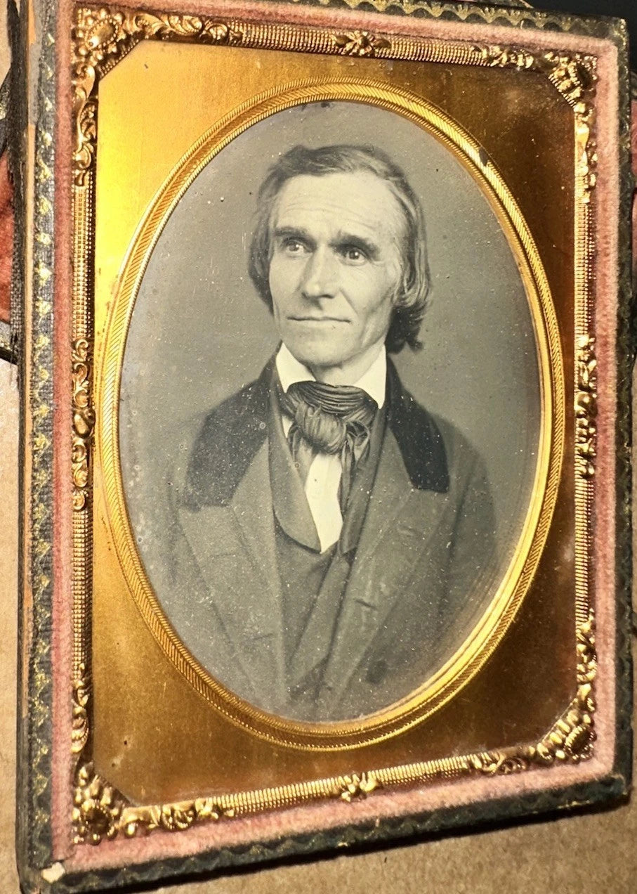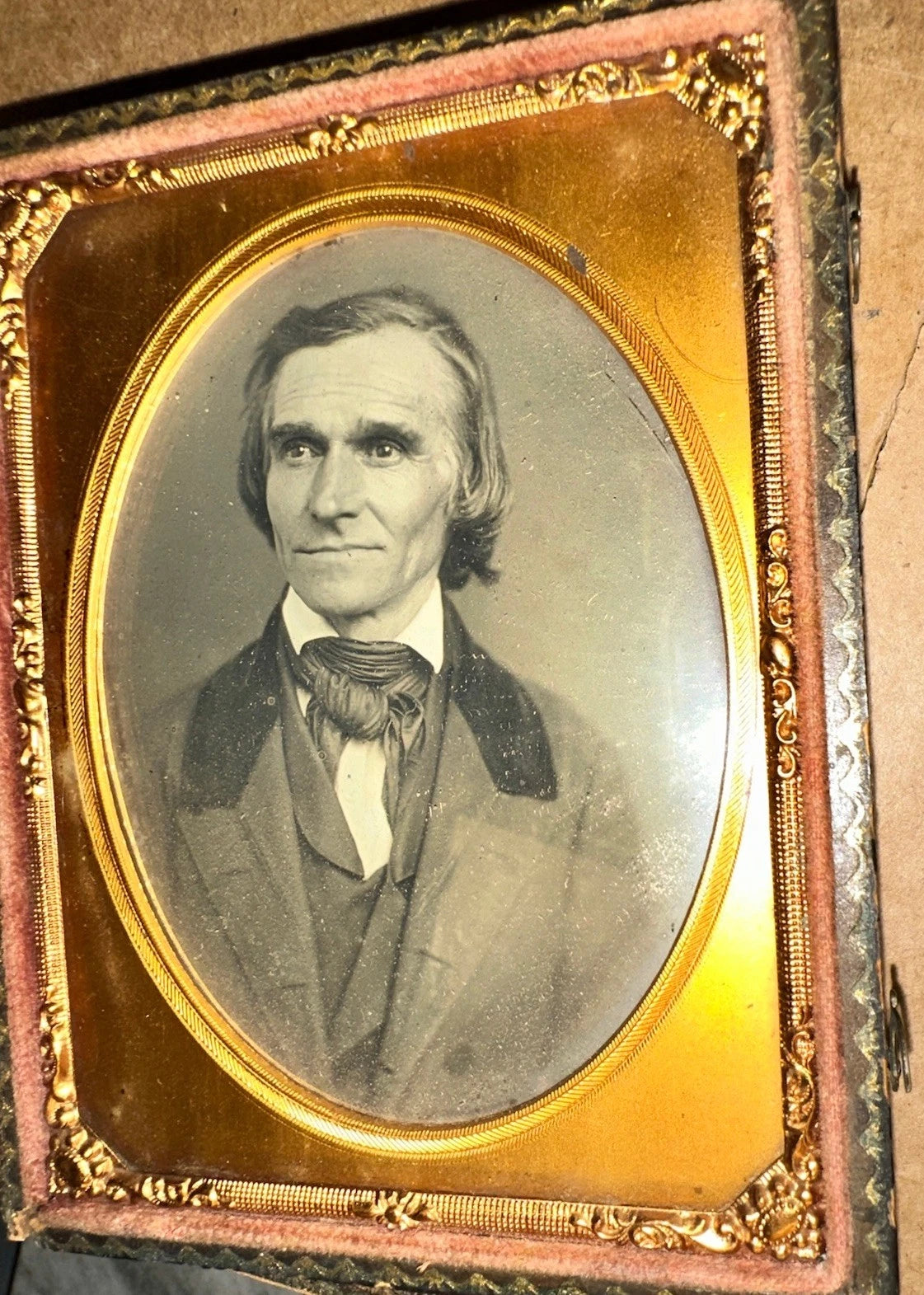 Quarter-plate daguerreotype, late-1850s. Very familiar looking man but I can’t ID him. Out of a Boston estate. Housed in a full case that is 4.75" x 3.75" when closed. Daguerreotype appears to be in very good antique condition with no apparent condition issues. Case covers are separated.