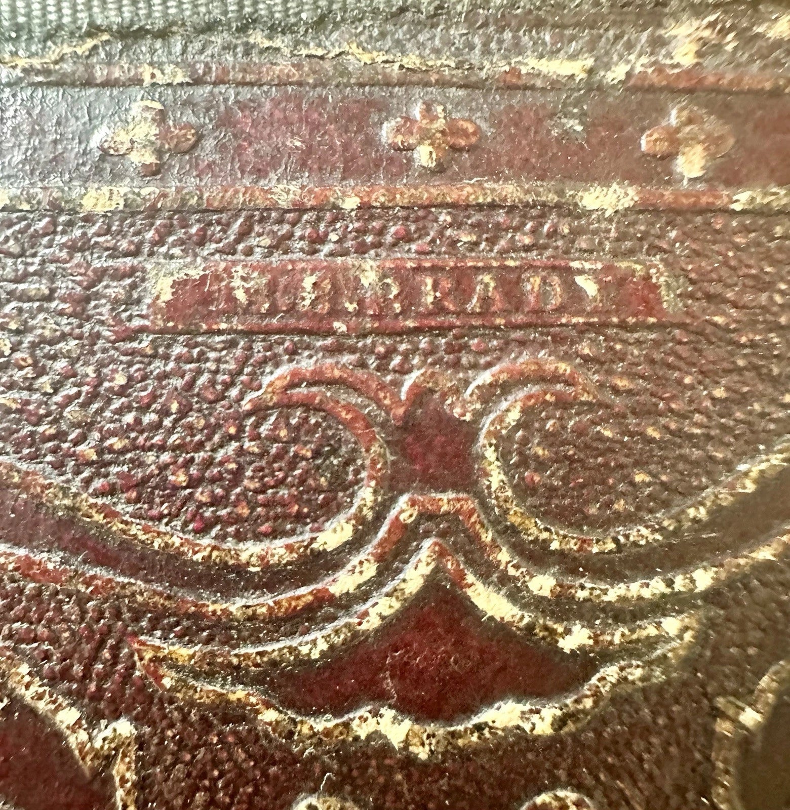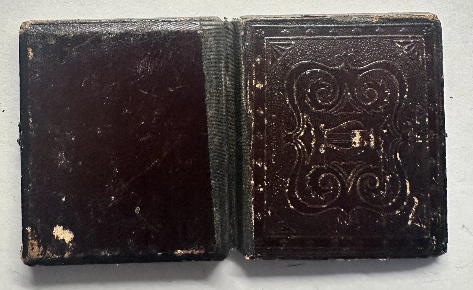 Sixth-plate daguerreotype of a man housed in a leather M.B. Brady case. Dag is unsealed. Looks like a couple of mat abrasions, haze and/or tarnish spots, but no scratches or swipes.. although when I viewed the enlargement I noticed a copper eruption on or near one of his eyes. Spine is taped.