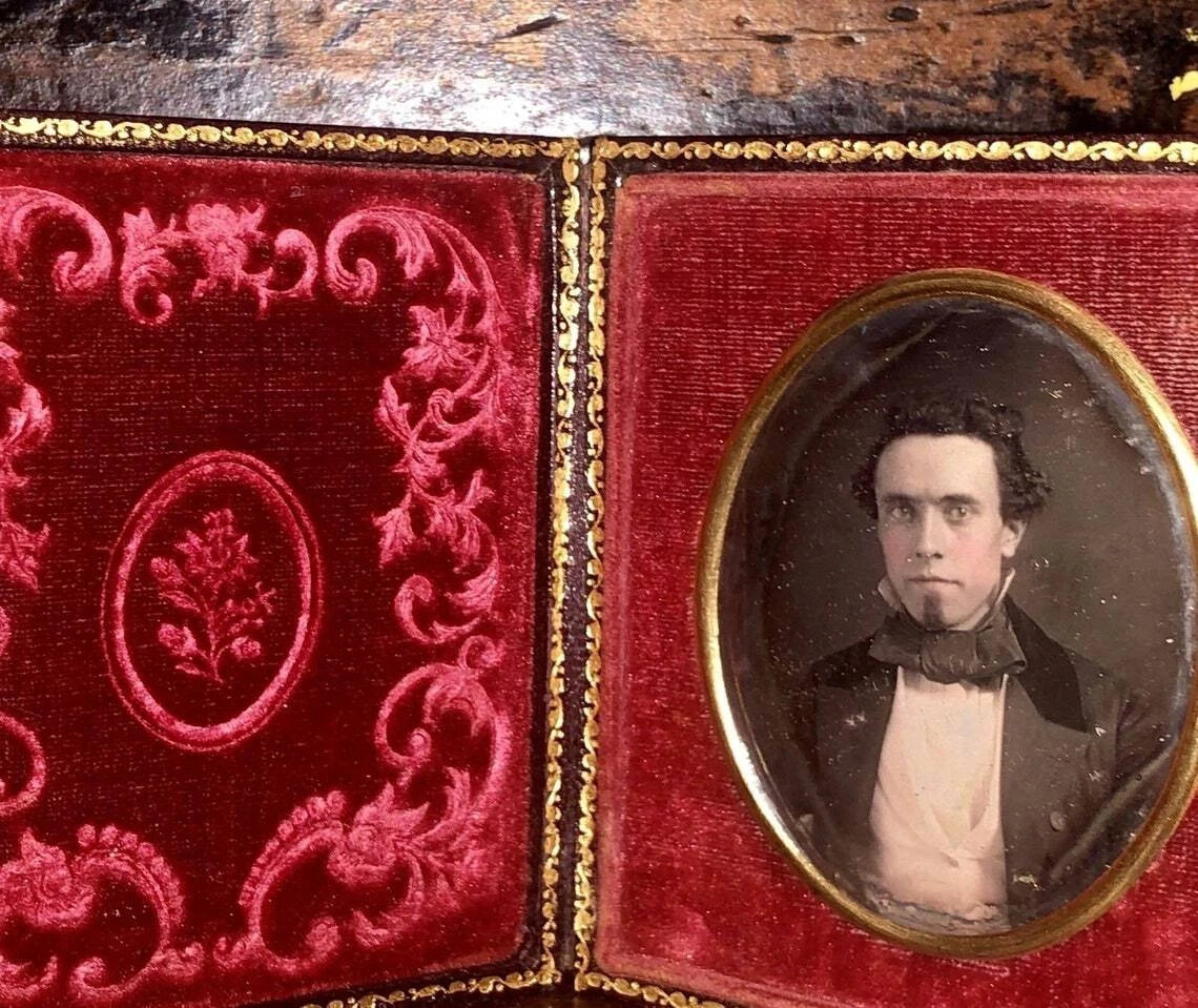 Housed in a nice intact 1/6 case, this oval dag is set into an unusual removable, velvet mat. The dag, including the gold frame, is 2.75" x about 2.25". It's behind glass and is in very good condition. Underside of the glass is a little dirty. There is also a tarnish ring, a few tiny mold spiders, speck of corrosion on his jacket and possibly a tiny mat abrasion in the lower right, but I think it's most likely a small scratch or chip on the glass.. whatever the case it's very minor.