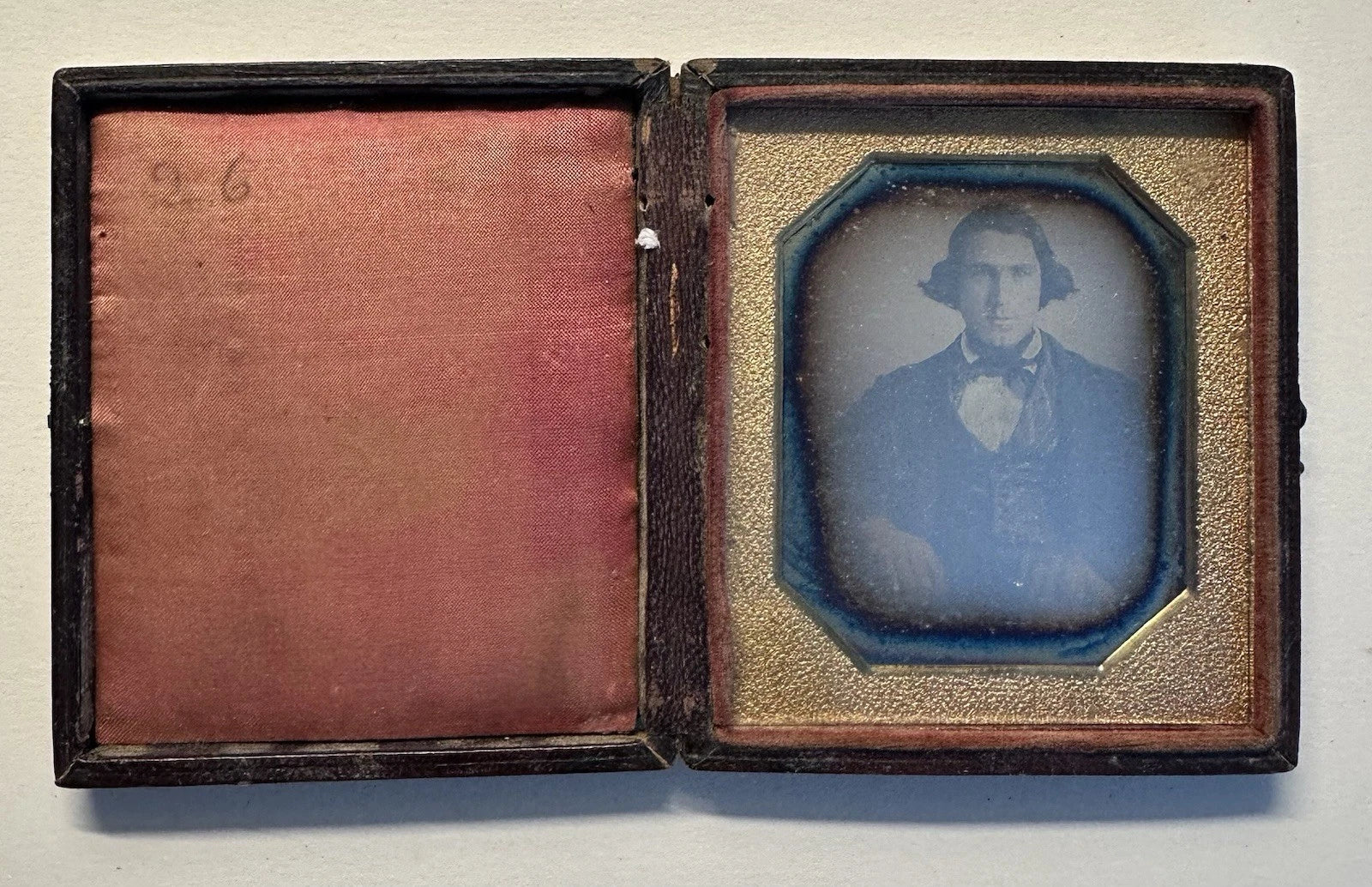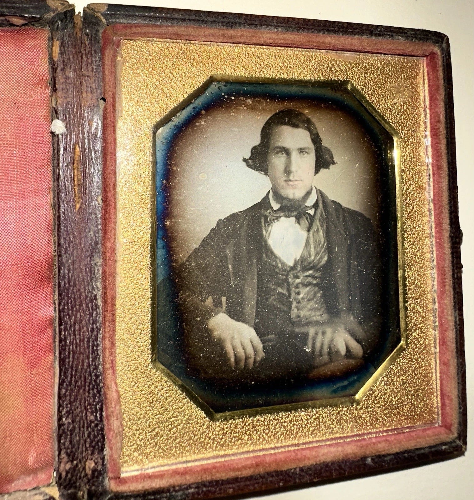 1/6 daguerreotype of a man in full leather case. His hand is blurred, and I wonder if he was holding something but I can't tell for sure. The dag has tarnish but looks to be in excellent condition. I can't get it out of the case so I'm unsure if it's sealed or not or if there is any info behind the image. The case is in very good intact condition.