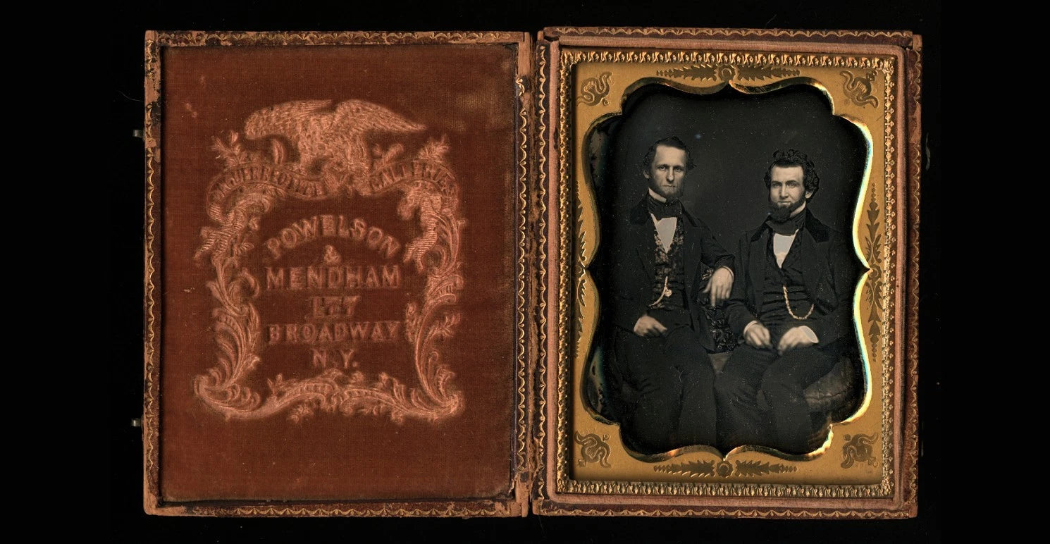 1/4 plate in full case, two well-dressed New York men, painted gold chains. Dag is in very good or better antique condition. Unsealed, with bits of the old paper seals still inside the case. The case covers are separated and the leather is worn.
