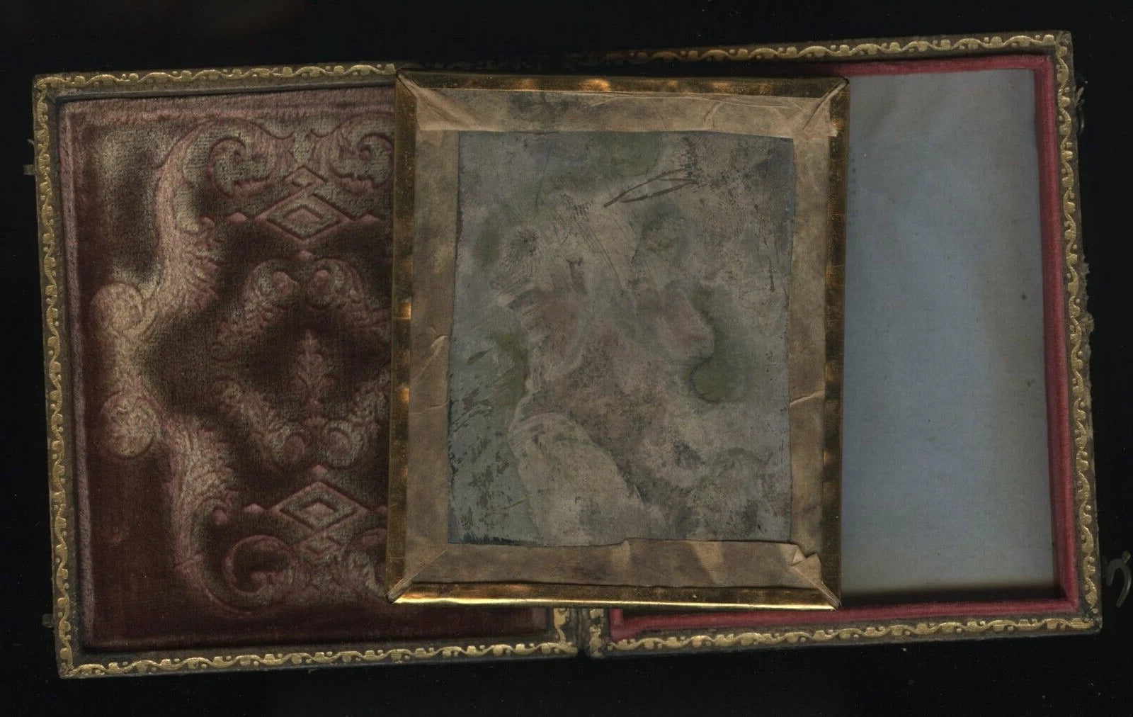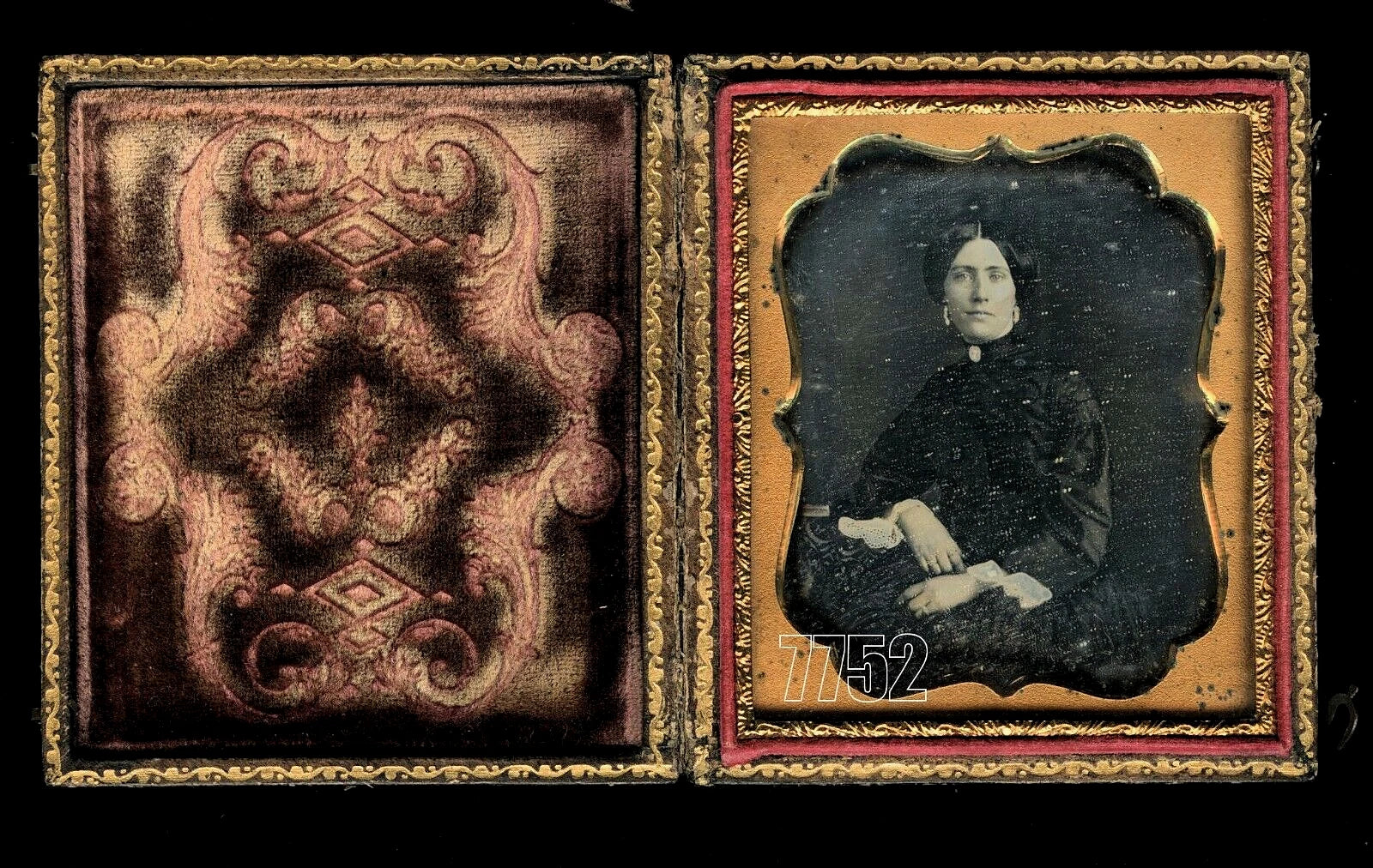 Pretty woman, painted gold jewelry, cameo brooch. Small book on the table next to her. 1/6 daguerreotype in full intact case, original seals intact. Very good or better antique condition.