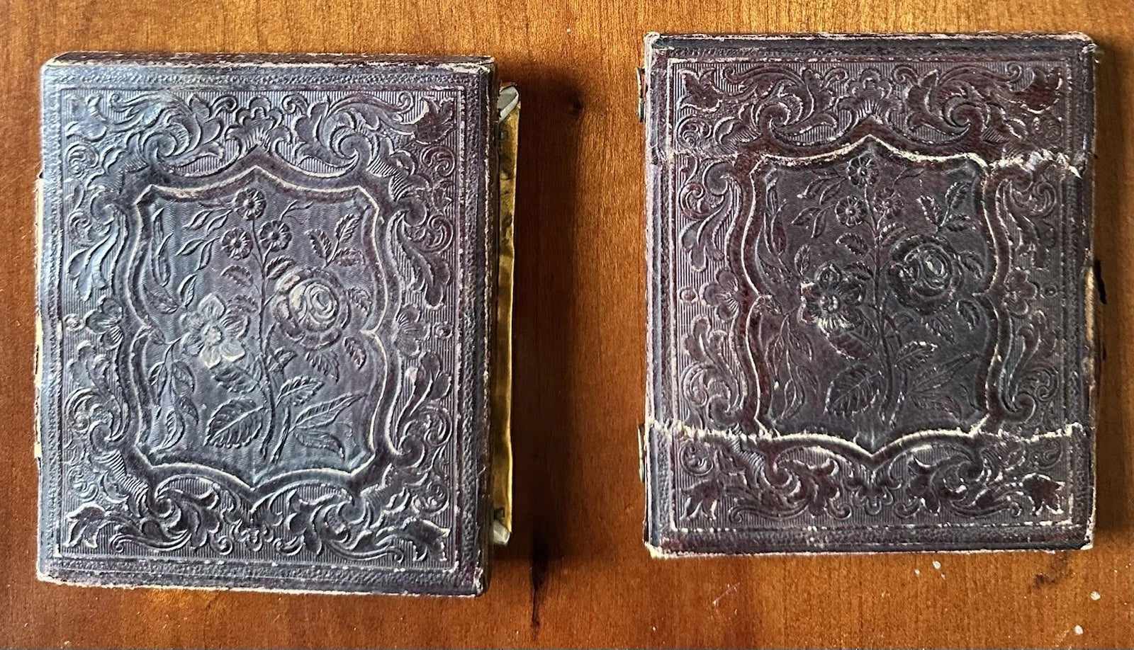 Two 1/6 daguerreotypes in a double case, with matching mats. Very good or better antique condition. Both dags have newer archival seals. The case is worn with separated covers. Shipping: Ground, well-packed mailer. Boxed Priority Mail is also available.