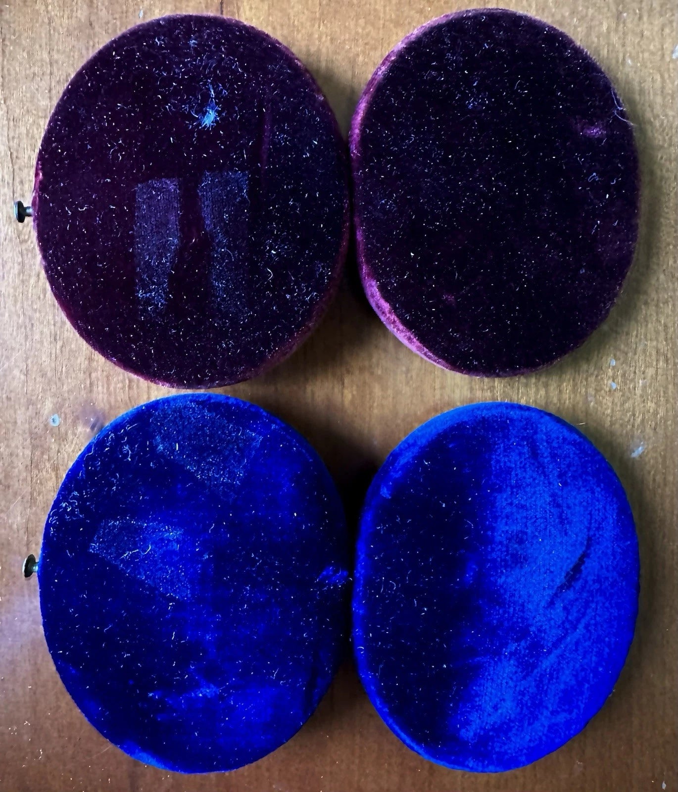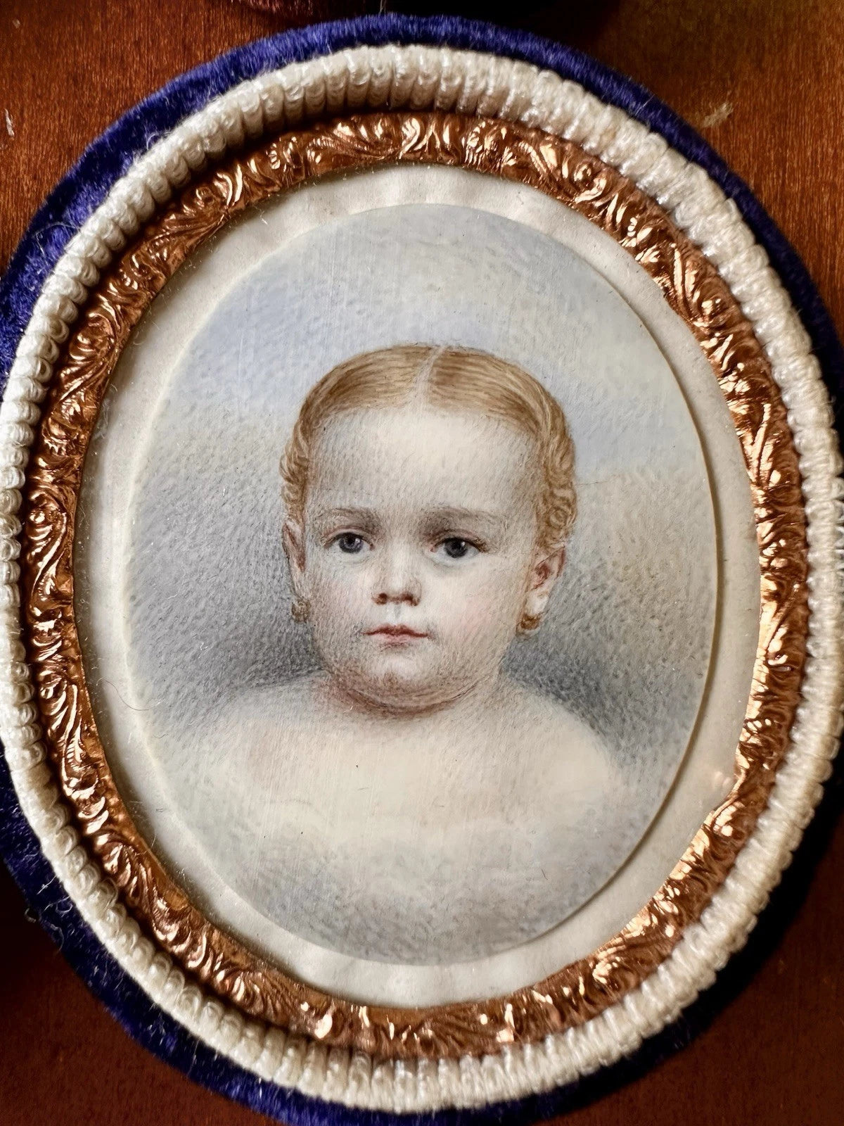 I believe the velvet cases date to the 1850s or 1860s, so the paintings might be from that time, or even a little bit earlier. They appear to both be in excellent antique condition. The cases are also very nice, though one of the push-buttons does not function perfectly.