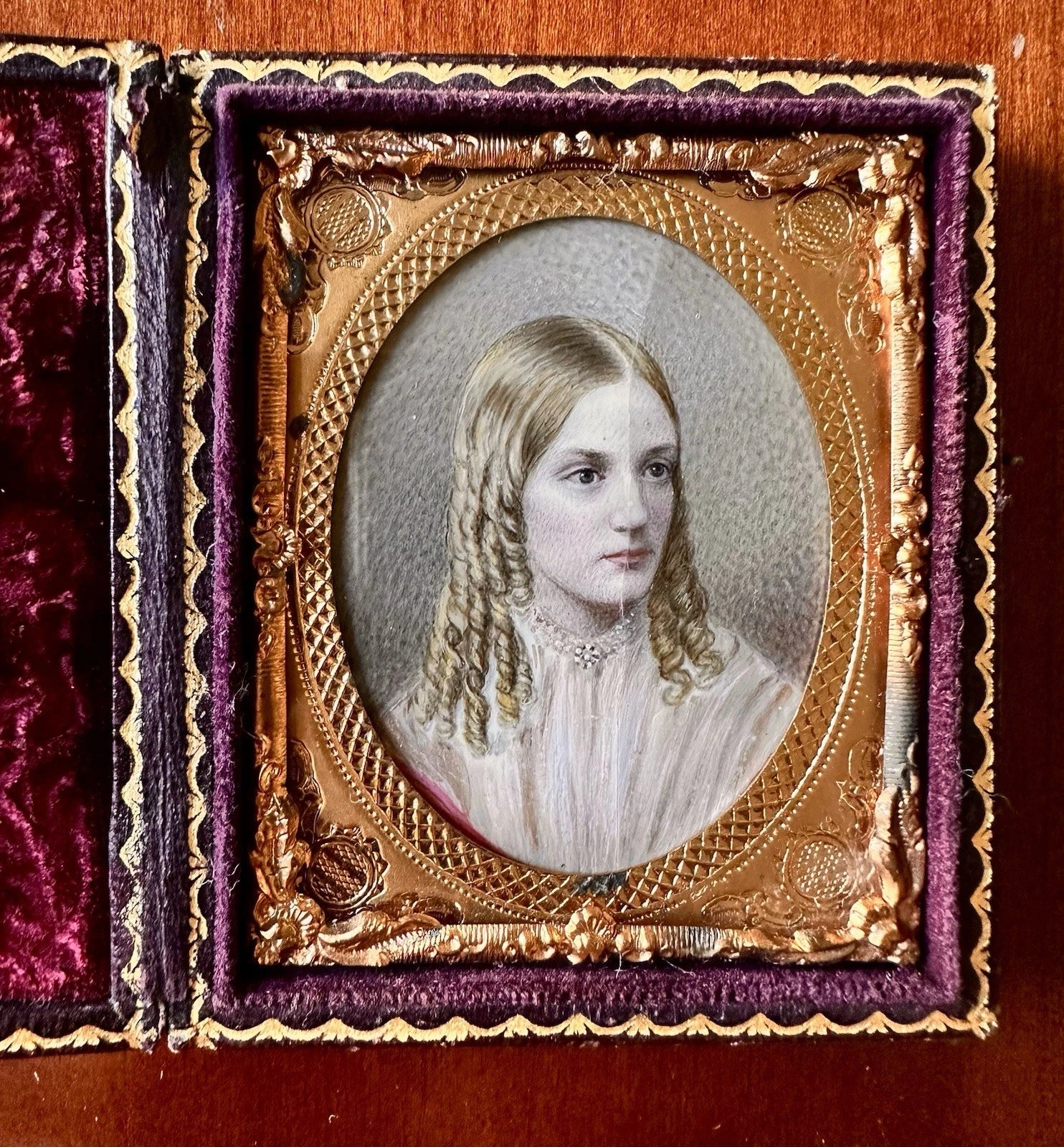 Original miniature painting of a blonde girl with long curls, behind cover glass, in an 1850s case. The painting has a vertical flaw through it.. it's not a crack, I'd call it more of a light bend... it's pretty light but still visible.