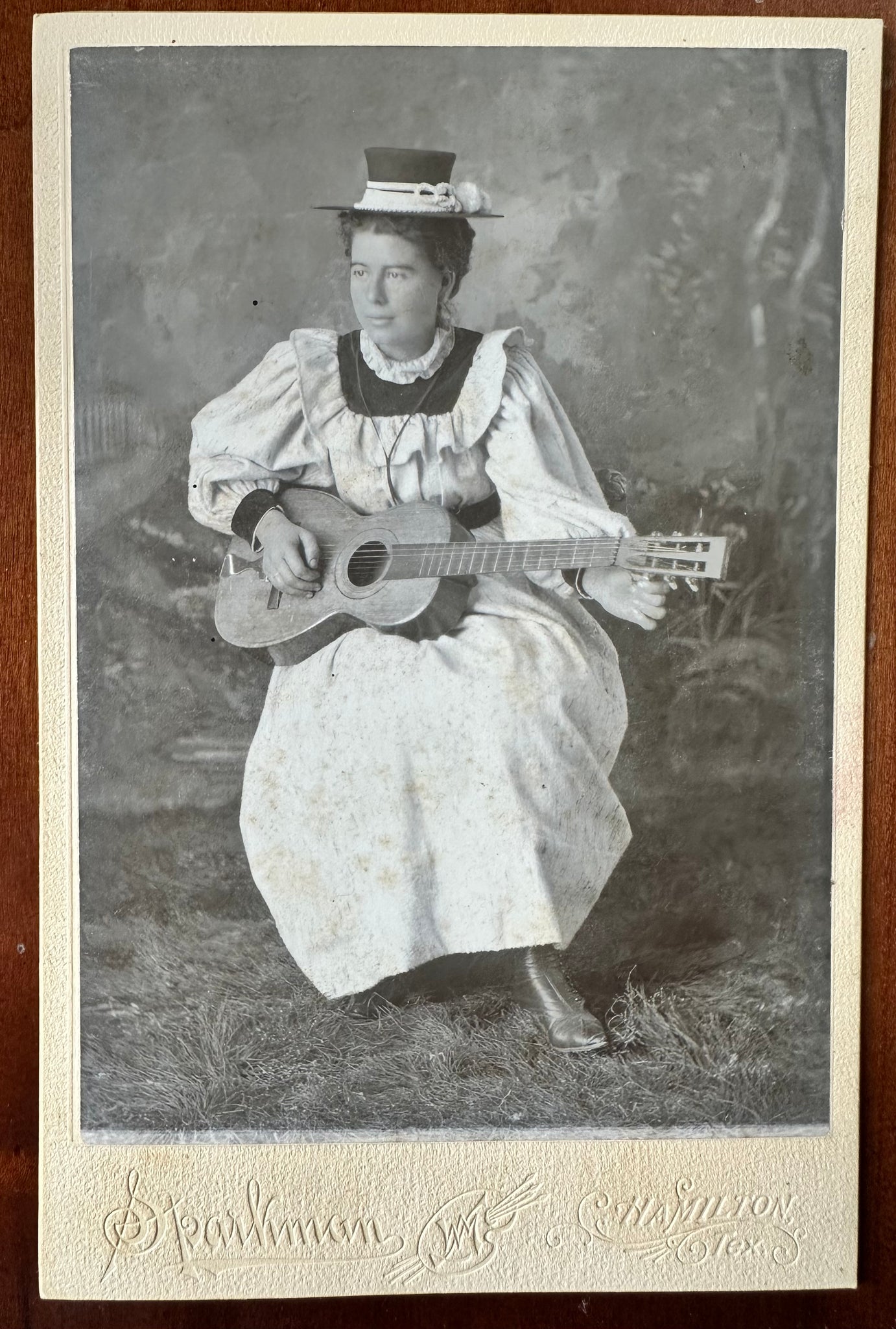 Original c.1900 cabinet card of a woman playing a guitar, by Texas photographer. Dimensions are 6.5" x 4.25, and it is in very good or better antique condition