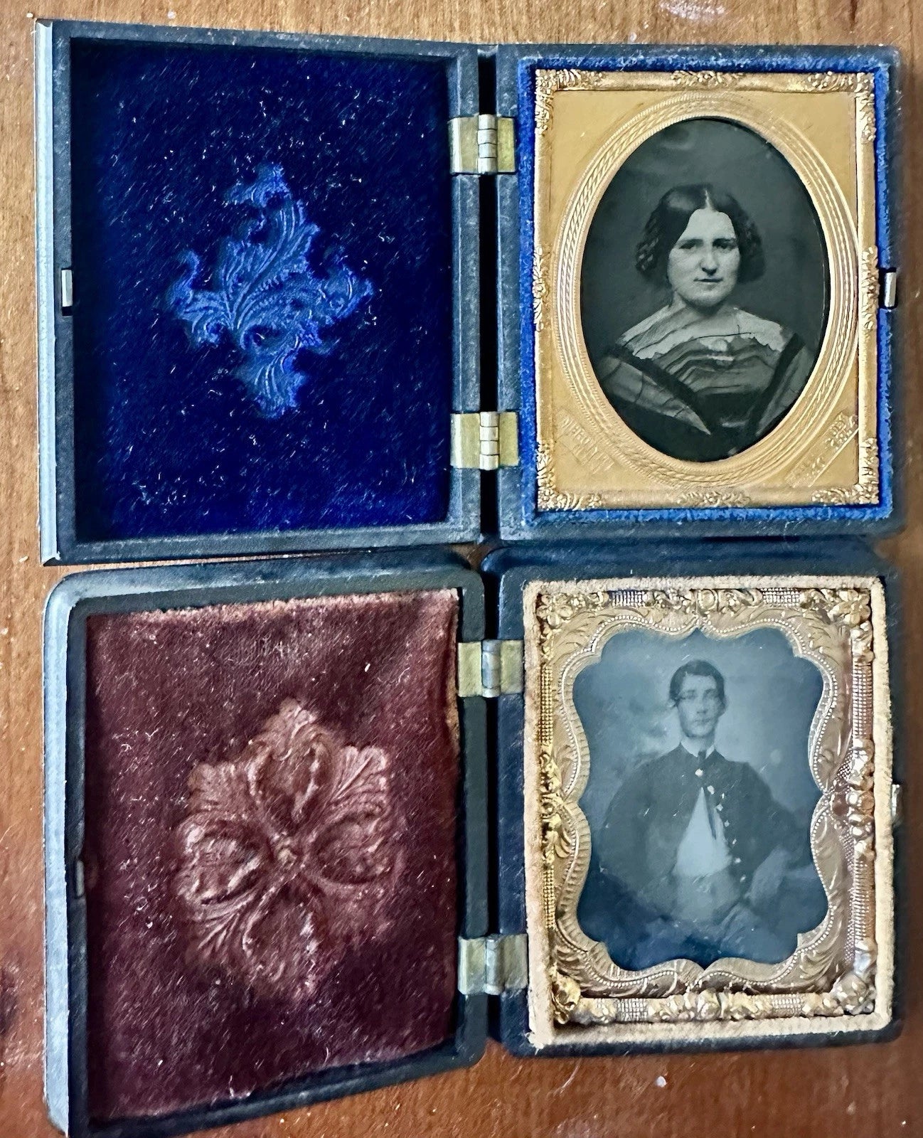 A lot of two images, a 1/9 tintype of a Civil War soldier and 1/9 ambrotype of his wife housed in union cases. They are identified inside of the cases with little clippings of newspaper as Horace Fritz and his wife Anna.