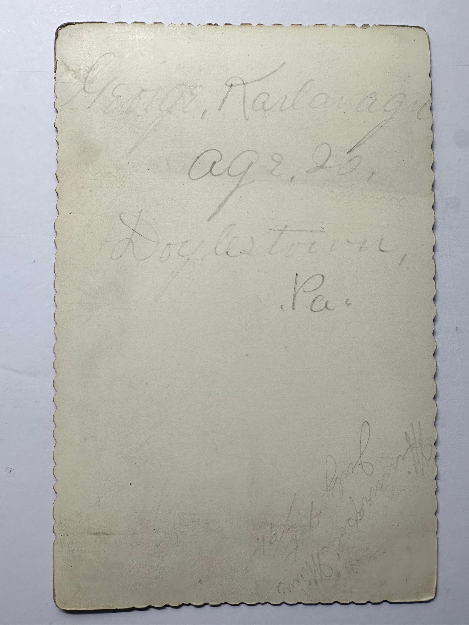 "George Karlavagn / age 20 / Doylestown, Pa" and "Minneapolis, Minn / July 4th/ 91." is written in pencil on the back.
