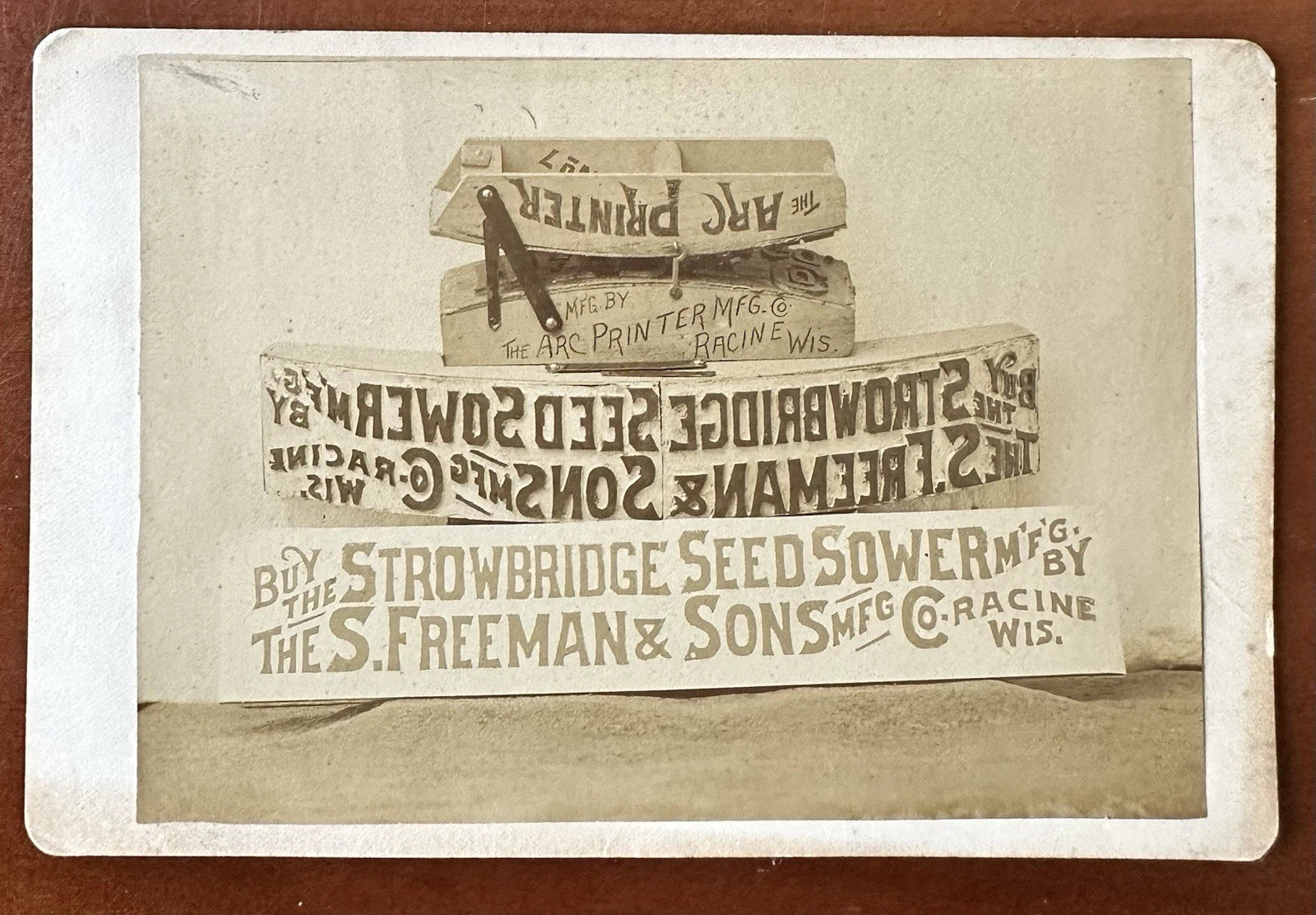 Original circa 1890 6.5" x 4.25" cabinet card showing a folding block for printing signs. The top shows the block in its closed position, the middle showing it open with the words, in reverse, visible, and the bottom is the sign it would produced. This printing invention was created by Edward A. Bishop of the Arc Printing Company out of Racine, Wisconsin.