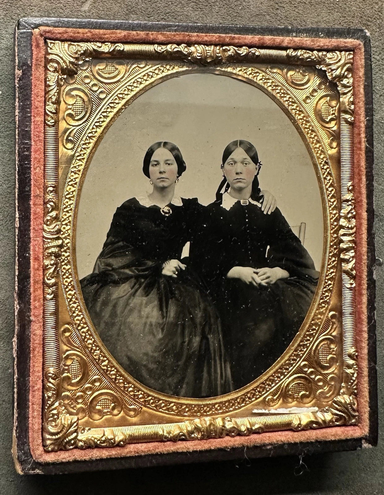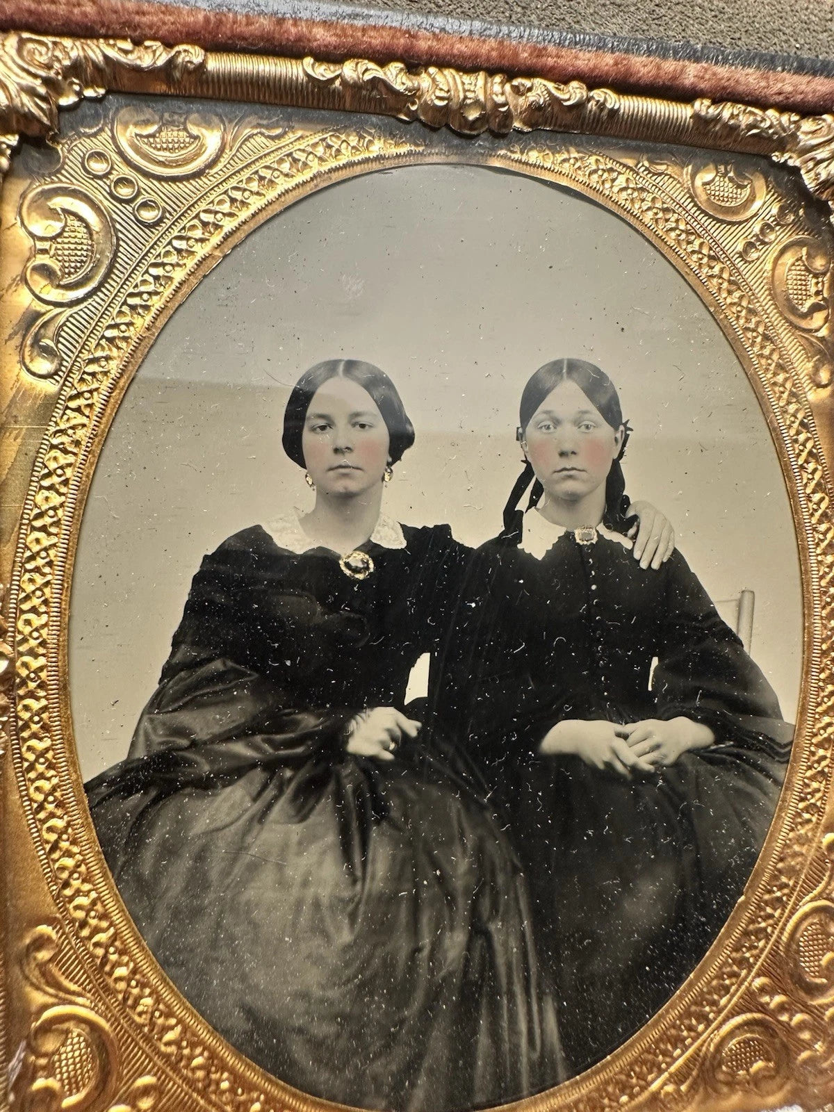 1/6 ambrotype on ruby glass in half of a case. Their brooches are highlighted by gold paint.