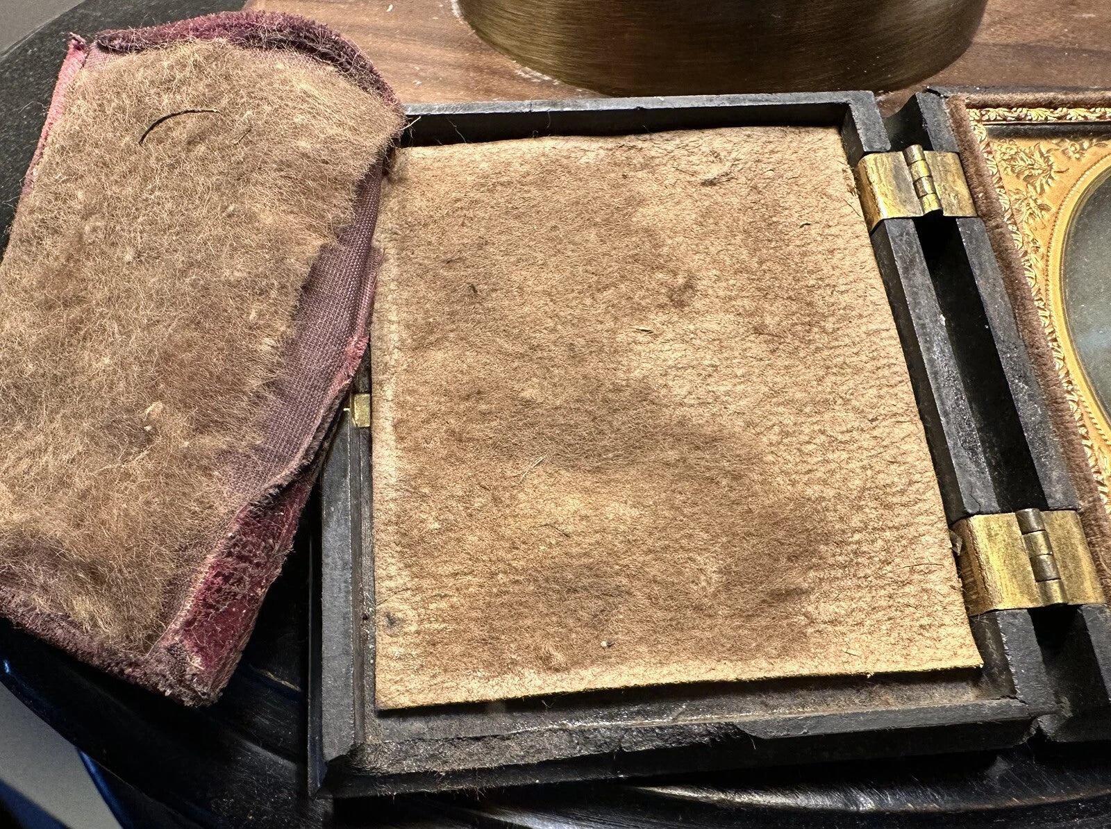 Original daguerreotype, well dressed man with a goatee, in 1/6 thermoplastic case. The dag appears to have its original seals and appears to be in excellent condition with a tarnish ring. The case has chips and damage along the bottom, and the pad is deteriorated as shown. The case is in overall POOR condition.