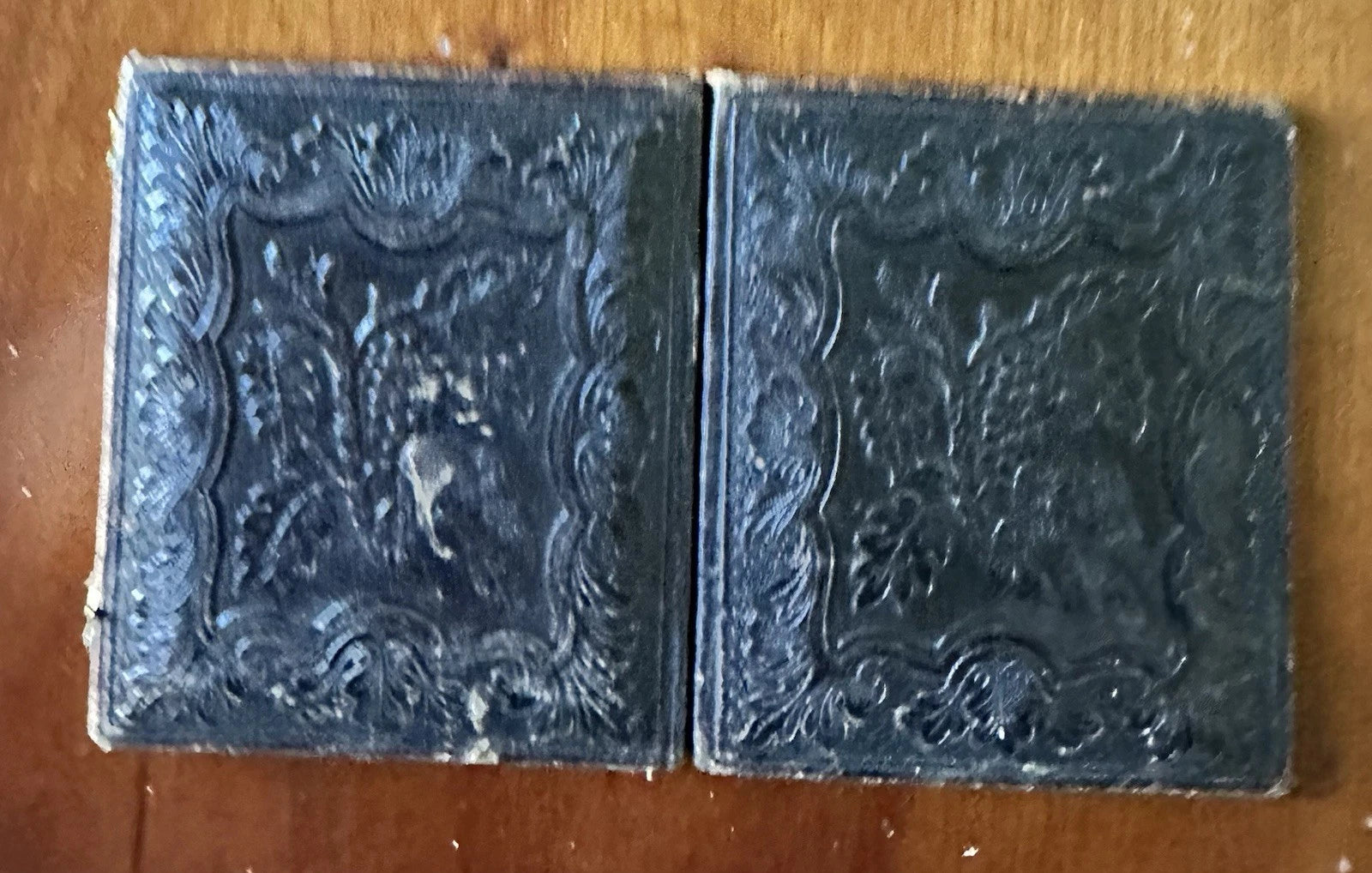 Original 6th plate tintype in a leather case, behind cover glass. There is a tax stamp on the back and some writing scratched into the surface, but I can't really make out what it says.