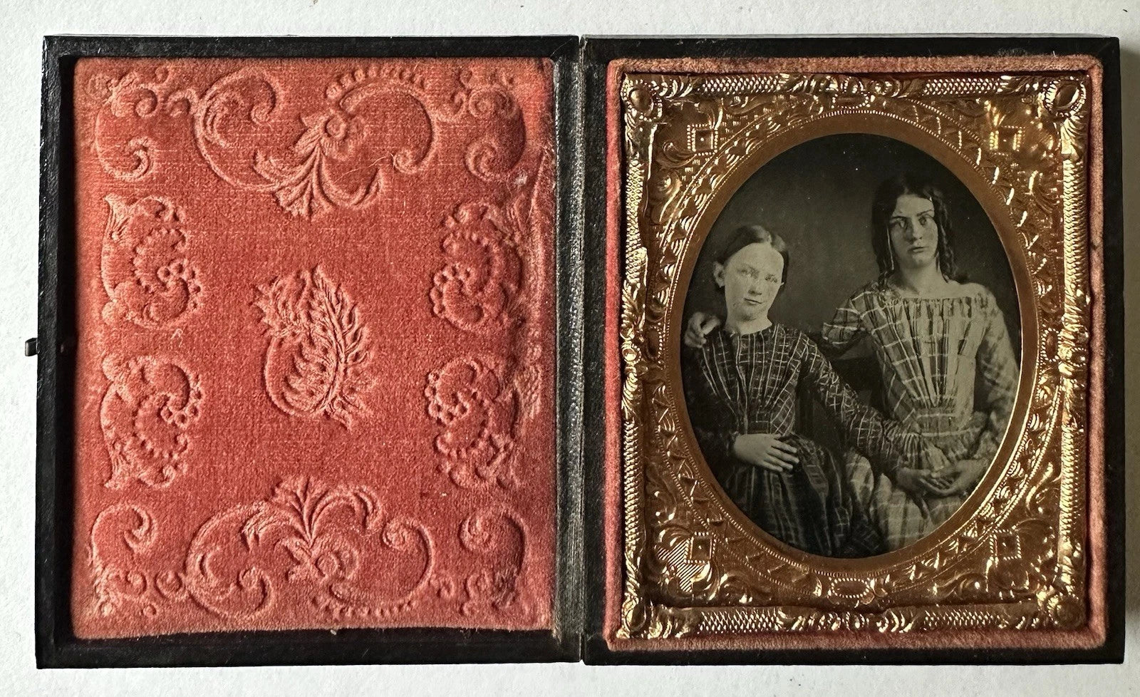 1/6 c.1860 ruby ambrotype of two sisters, identified inside of the case. The girls were Jane Elisabeth Slocum Rogers (1834-1912) and her sister Mary Eleanor Slocum (1838-1869). They lived in Brownsville, PA at the time this photo was taken. This might be a photographer's copy c.1850 daguerreotype because the girls look to be around 9-13 years old or so to me.