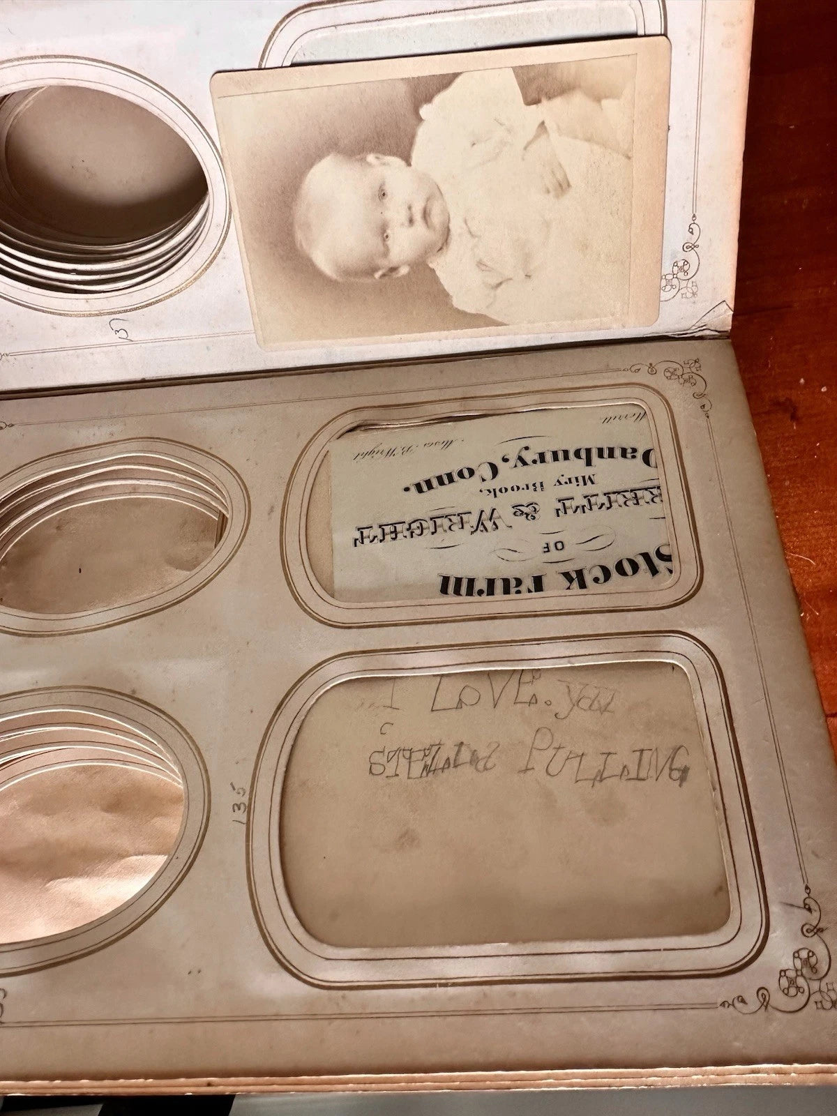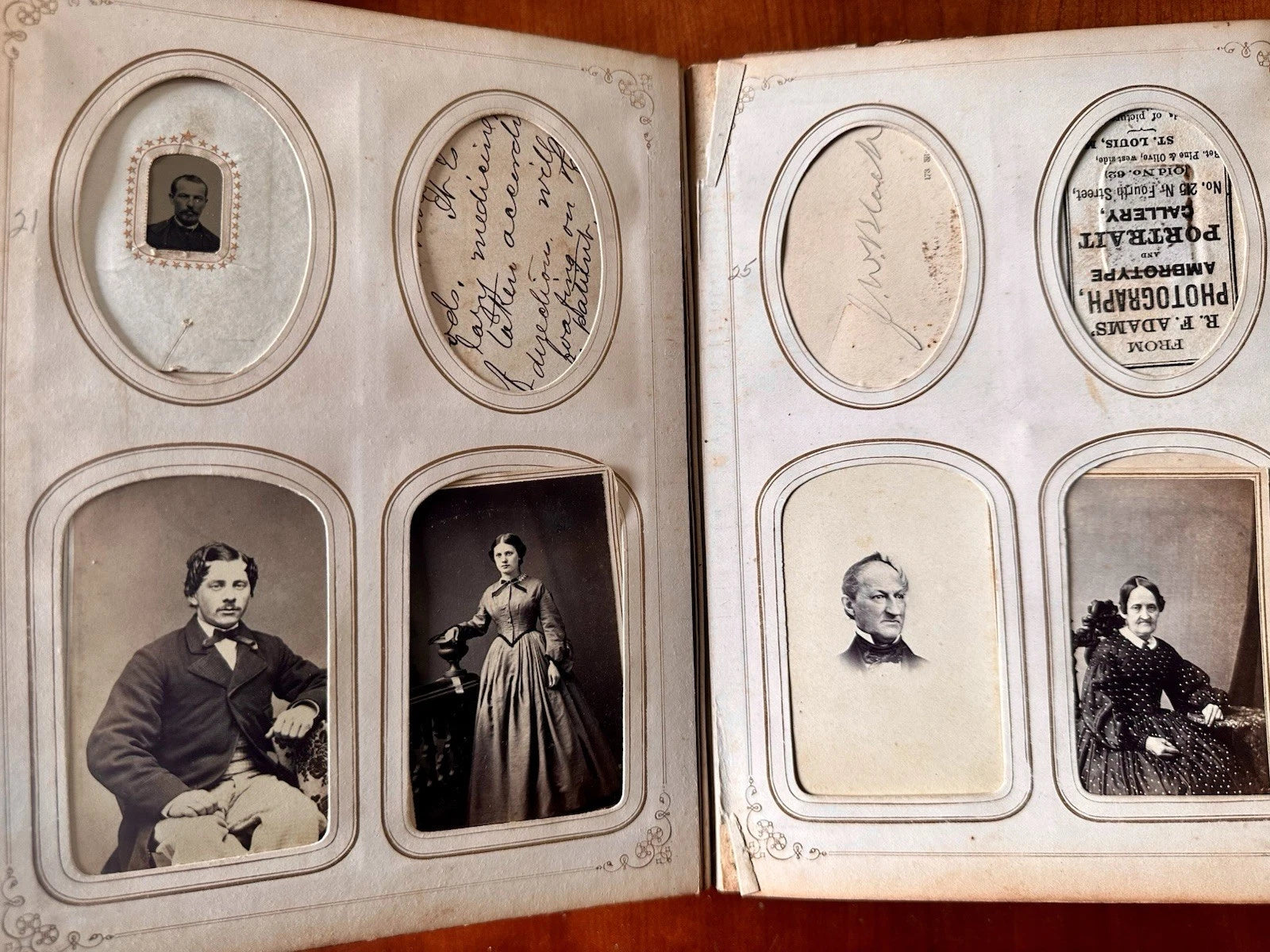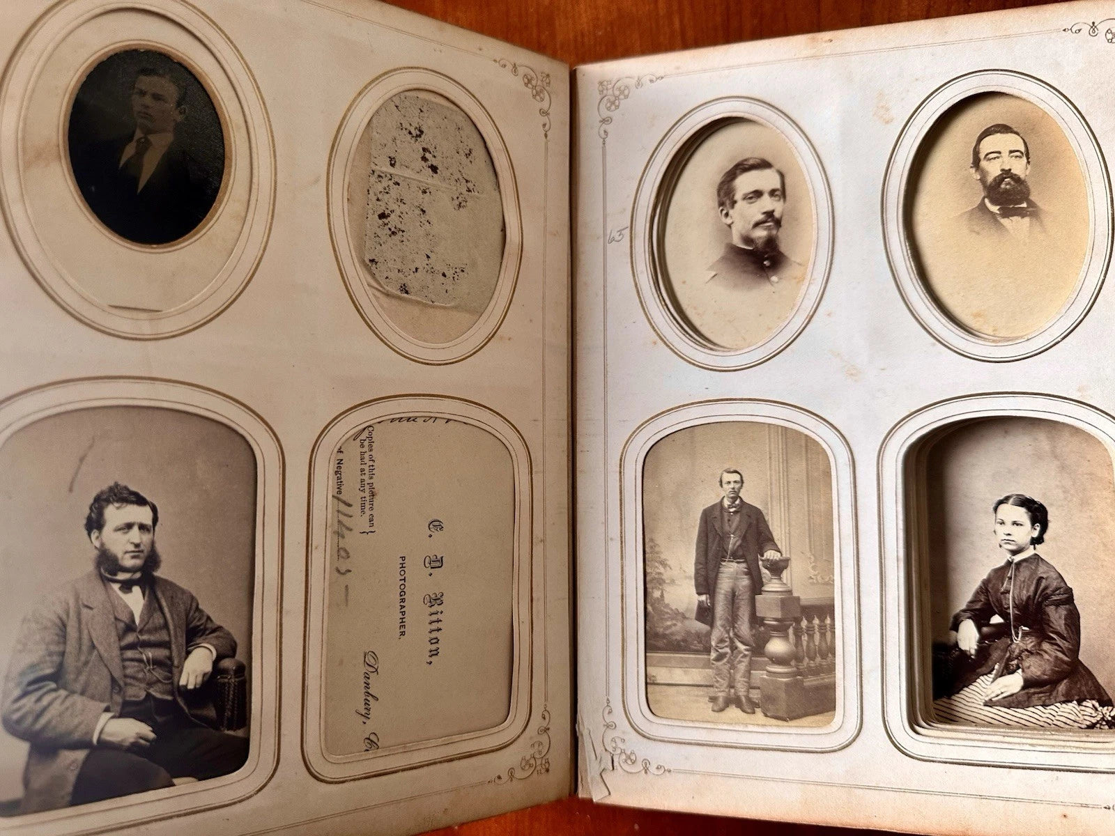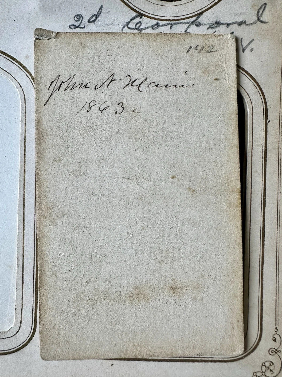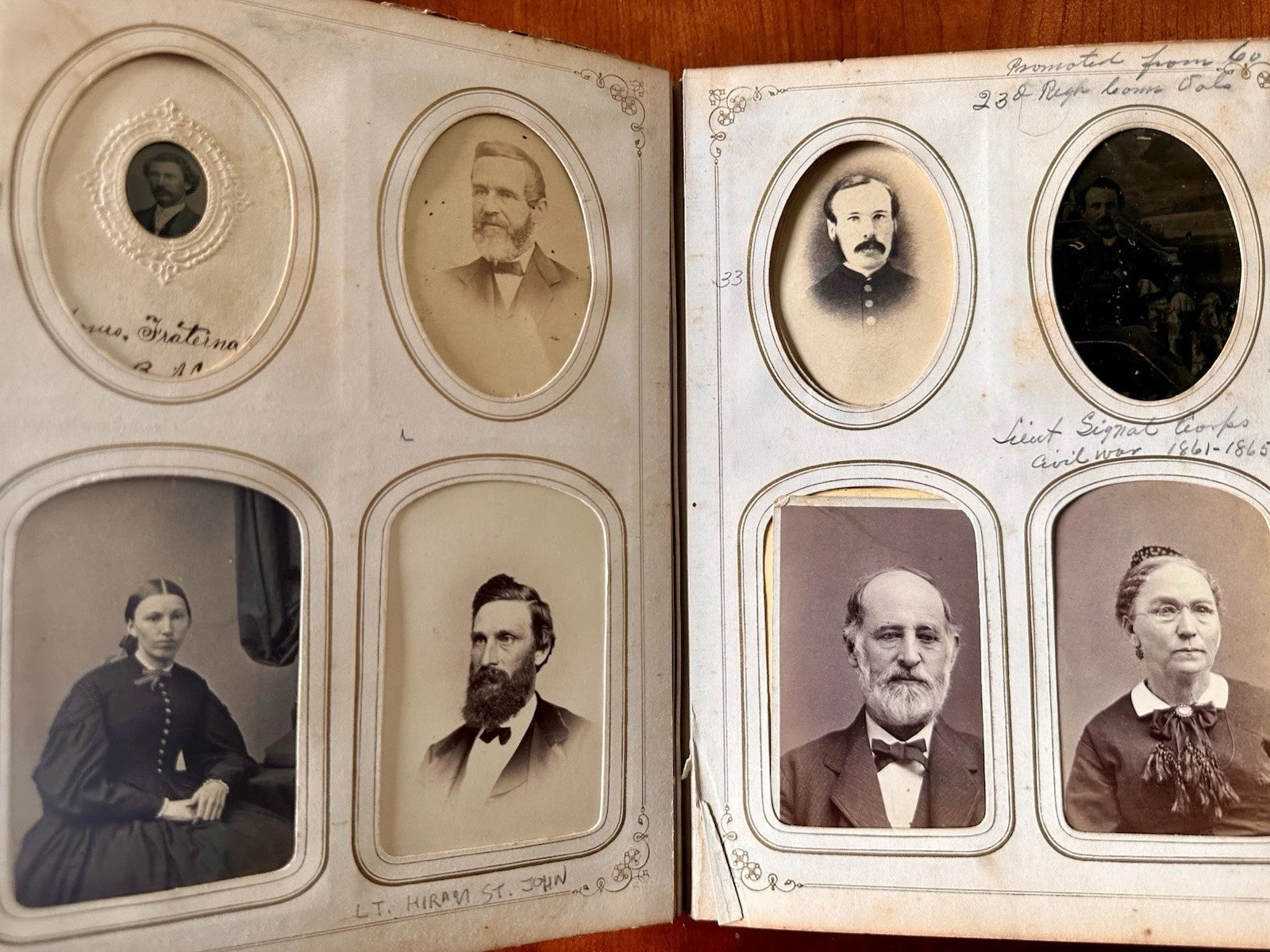 Large 1860s photo album partially filled with original CDVs and tintypes. The owner of the album was John North Main (1841-1901) who was a Civil War soldier, a Signal Corps Officer in the 23 Connecticut Infantry. At least three of soldiers in this album, including a 1/9 plate tintype are of him. There are one or two other soldiers as well.