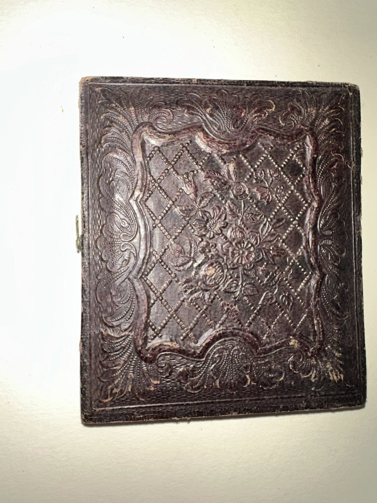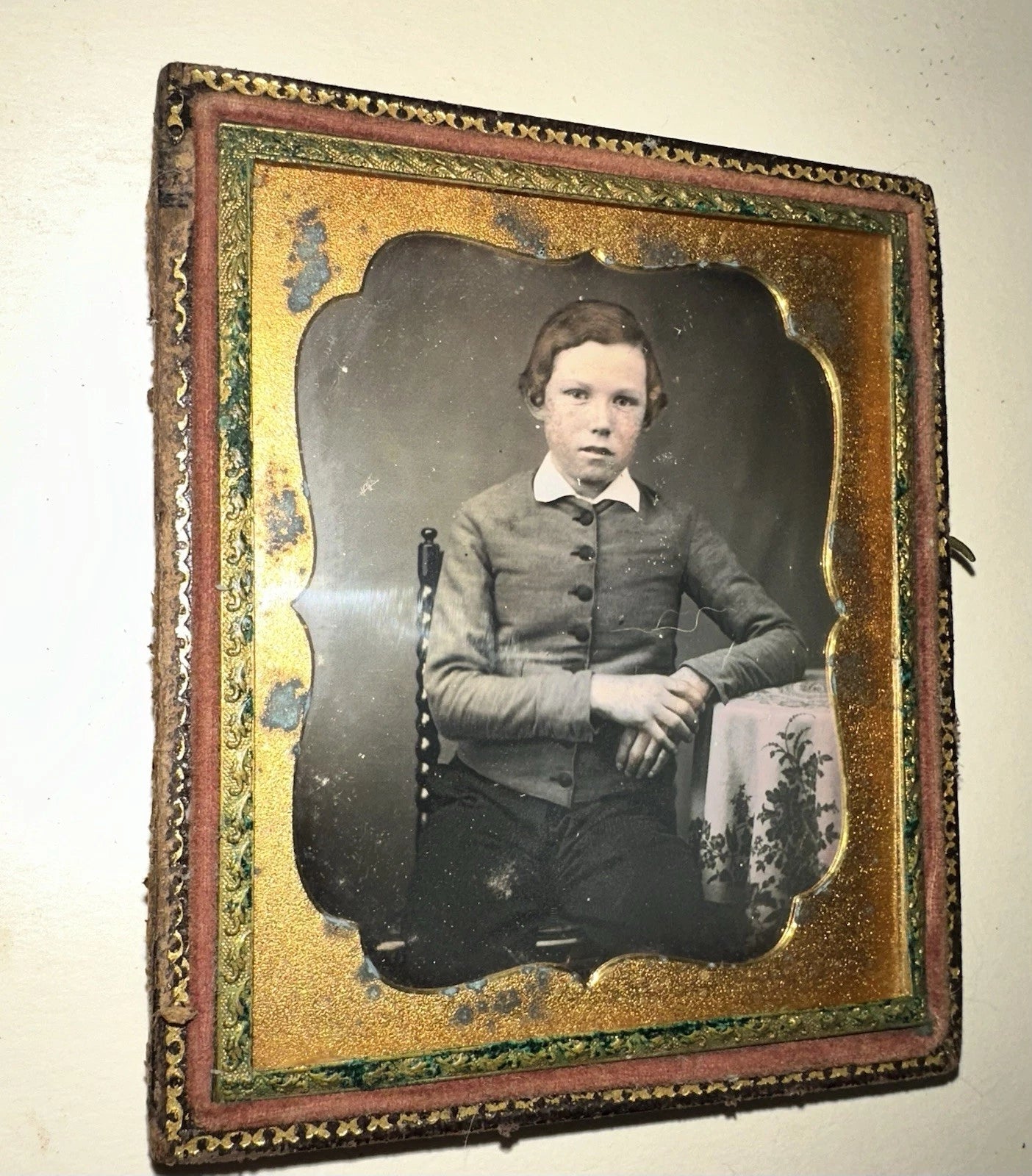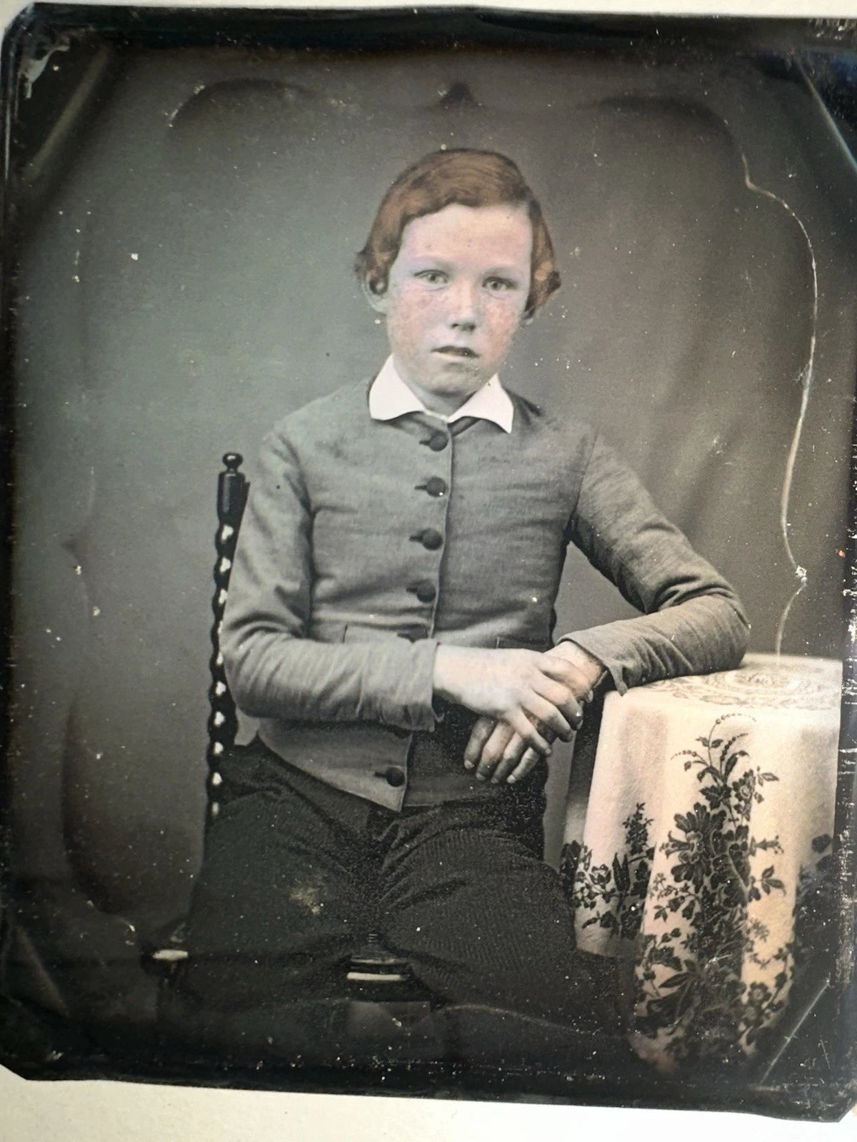 1/6 daguerreotype of boy with freckles and tinted red hair! Image is in half of a case and is sharp and clear - the glass is a little foggy. Unsealed, most of the old seals are inside of the case.