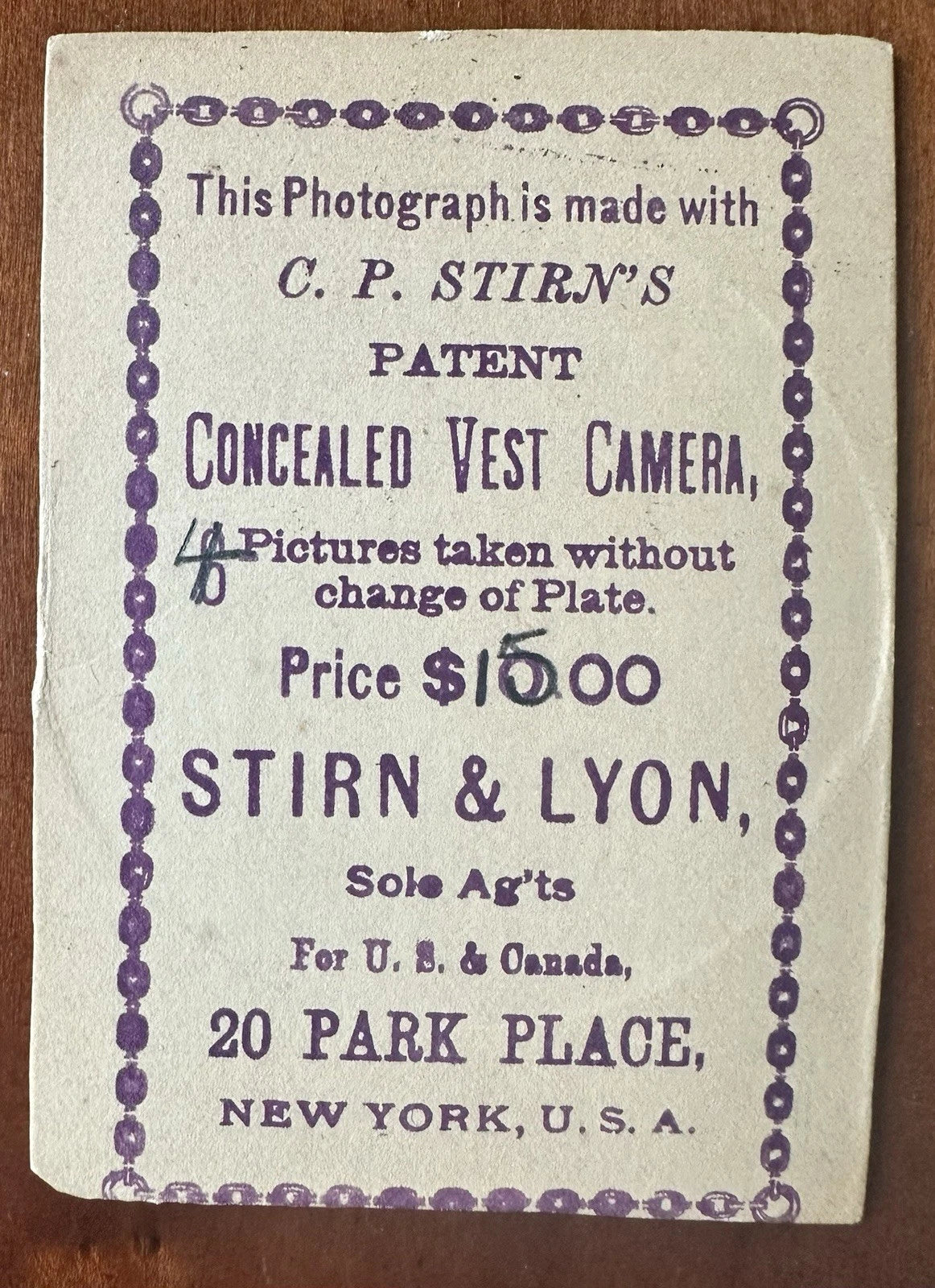 Rare original “spy” photo taken with a concealed vest camera. VG antique condition overall, slightly trimmed to 3.5” x 2.5”. Shipping: Ground photo mailer. Boxed Priority also available.