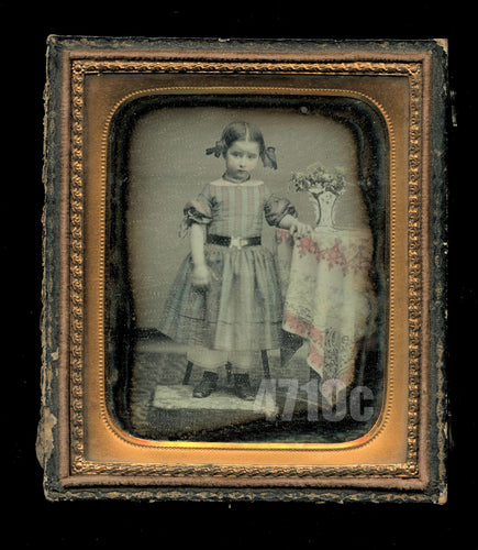Sealed Tinted 1850s 1/6 Daguerreotype Cute Little Girl with Vase of Flowers
