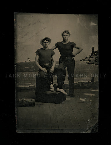 antique tintype photo two men / friends - beach and ocean scene backdrop