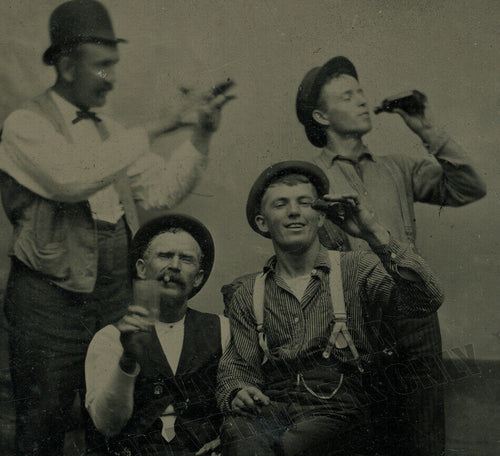 Antique Tintype Photo Beer Drinking Group of Men Painted Beach Sailboat Backdrop
