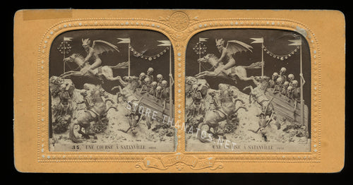 RARE 1860s Devil & Skeletons Photo / Tissue Stereoview ~ Satan Racing His Horse in Hell
