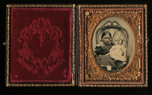 Antique Victorian Ambrotype Photo ID'd Little Girl Holding China Doll Rare Case