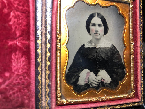 nice c 1860 tintype in full case, pretty woman, tinted pink cuffs & gold jewelry