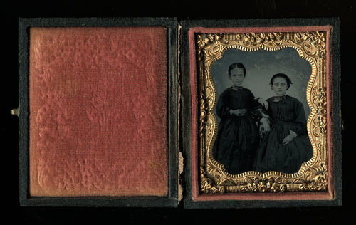 civil war era 1860s tintype photo girls, sisters holding flowers - in mourning?