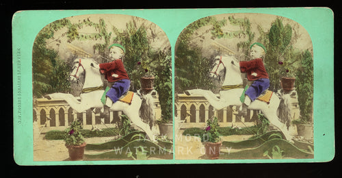 1860s tinted stereoview by thorne - little boy riding toy hobby / rocking horse