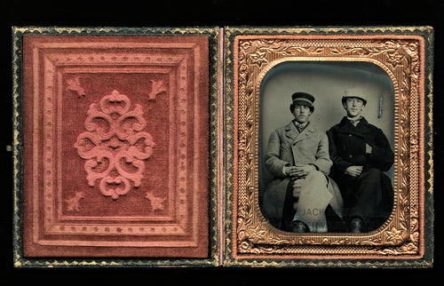 1860s tintype of men friends in hats & jackets - civil war tax stamps on back