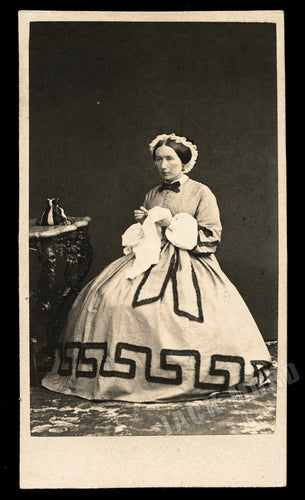 nice civil war era cdv photo woman knitting greek key dress sewing bag on table