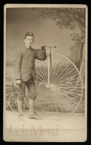 antique cdv man w star badge on hat posing w high wheel penny farthing bicycle
