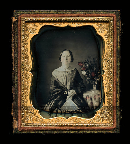 Beautiful Daguerreotype Pretty Woman Holding Fan, Crystal Vase, Tinted Flowers!